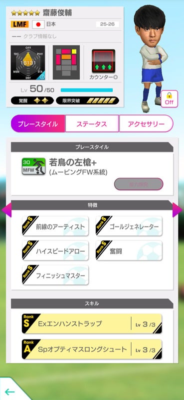 今回のスカウトでは、新★5選手が「レベルMAX(Lv.50)/覚醒2段階達成/各スキル・各能力UP Lv.3達成」で登場します。