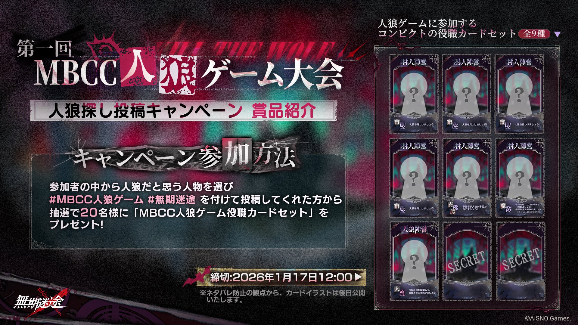 期間中、人狼だと思う人物の名前を「#MBCC人狼ゲーム」「#無期迷途」を付けて投稿してくれた方から、抽選で20名様に「MBCC人狼ゲーム役職カードセット」をプレゼントいたします!