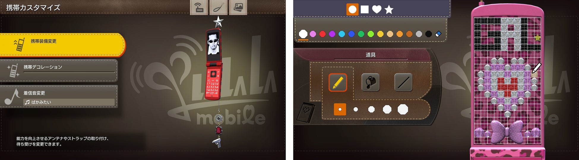 携帯を自由に飾り付けることができる「携帯カスタマイズ」ではアンテナやストラップ、待ち受けなどを付け替えることができる。さらに、パーツによって桐生の能力がアップ。いろいろな付け替えを楽しんでみよう。