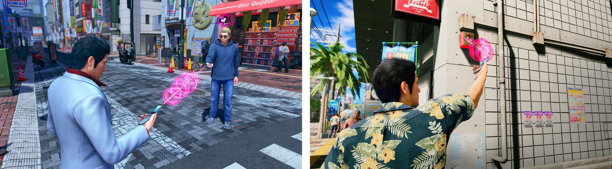 本作では、沖縄・琉球街と東京・神室町それぞれのファッションを自由にコーディネートできる。琉球街では涼しげにビーチサンダルとかりゆしウェア、神室町では盛り髪にモノトーンでキメてギャル男ファッションなど、豊富なラインナップから自分好みのスタイルを見つけ出そう!