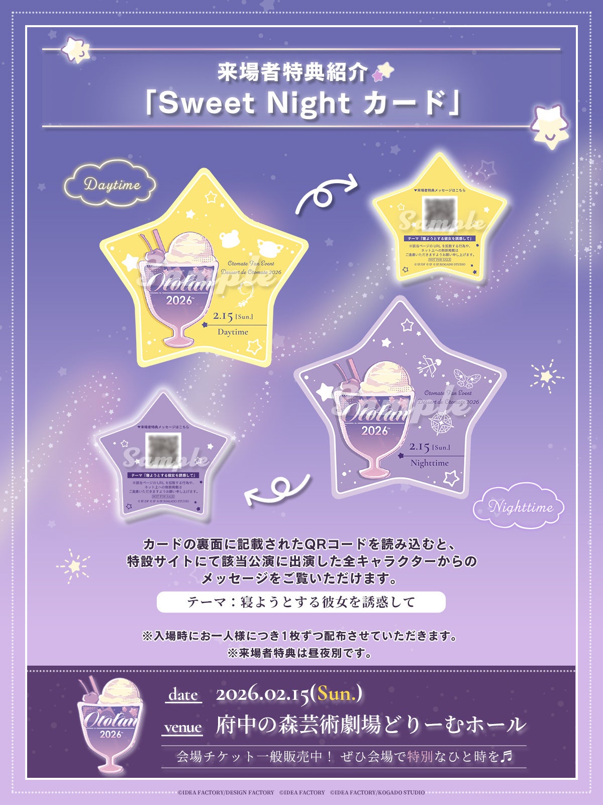 来場者特典の「Sweet Night カード」は、カード裏面に記載されたQRコードを読み込みと、特設サイトにて該当公演に出演した全キャラクターからの特別なメッセージをご覧いただけます。