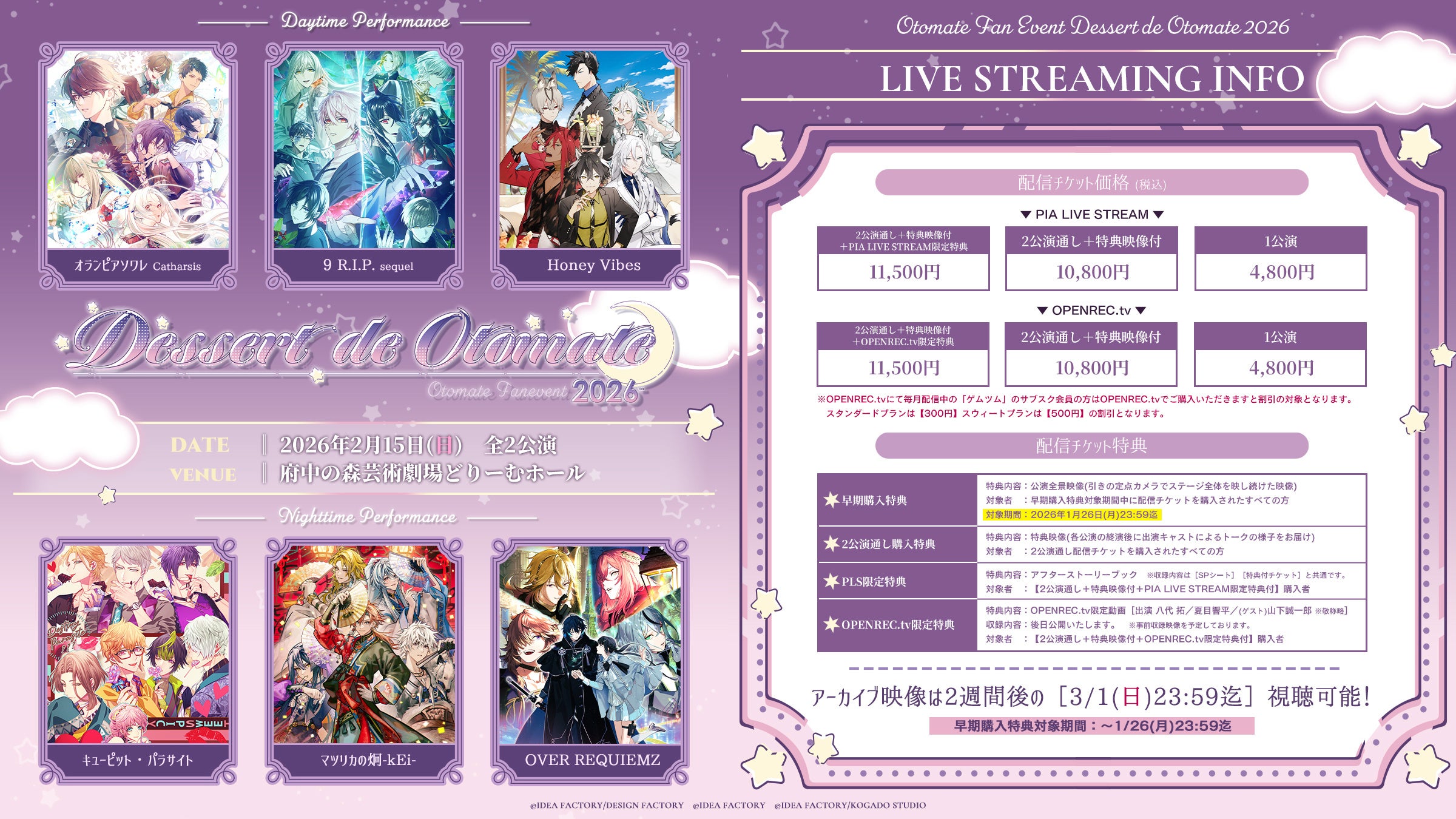 アイディアファクトリー株式会社(代表取締役社長:佐藤 嘉晃/所在地:東京都豊島区)の女性向けゲームブランド「オトメイト」は、2026年2月15日(日)開催予定のオトメイトファンイベント「Dessert de Otomate 2026」の会場物販・通販情報及び、チケット特典絵柄を公開いたしました。