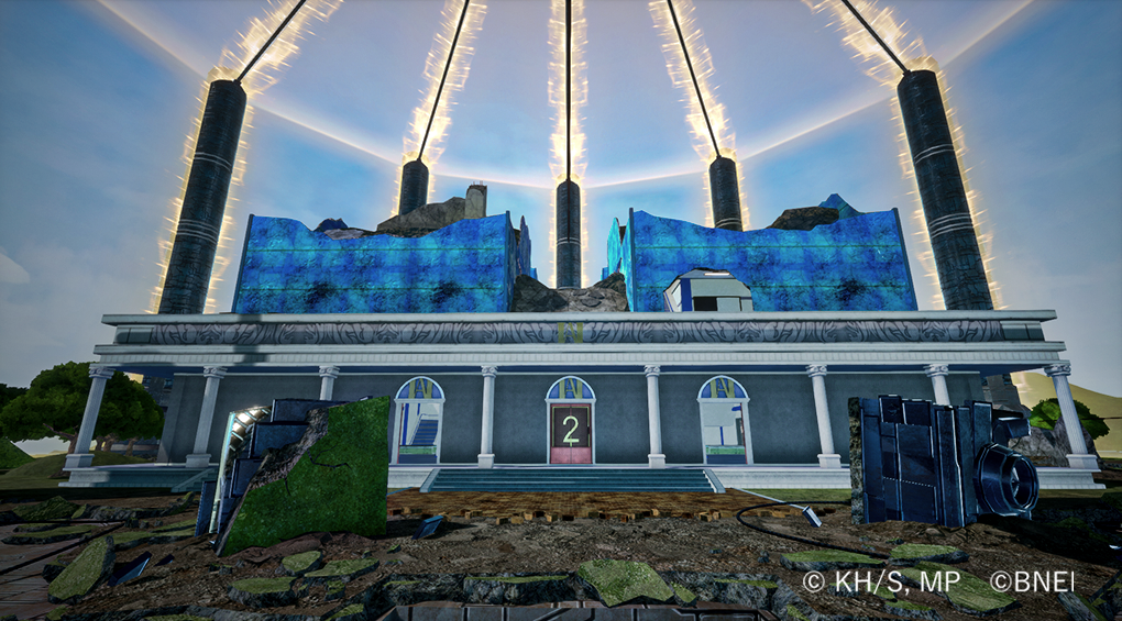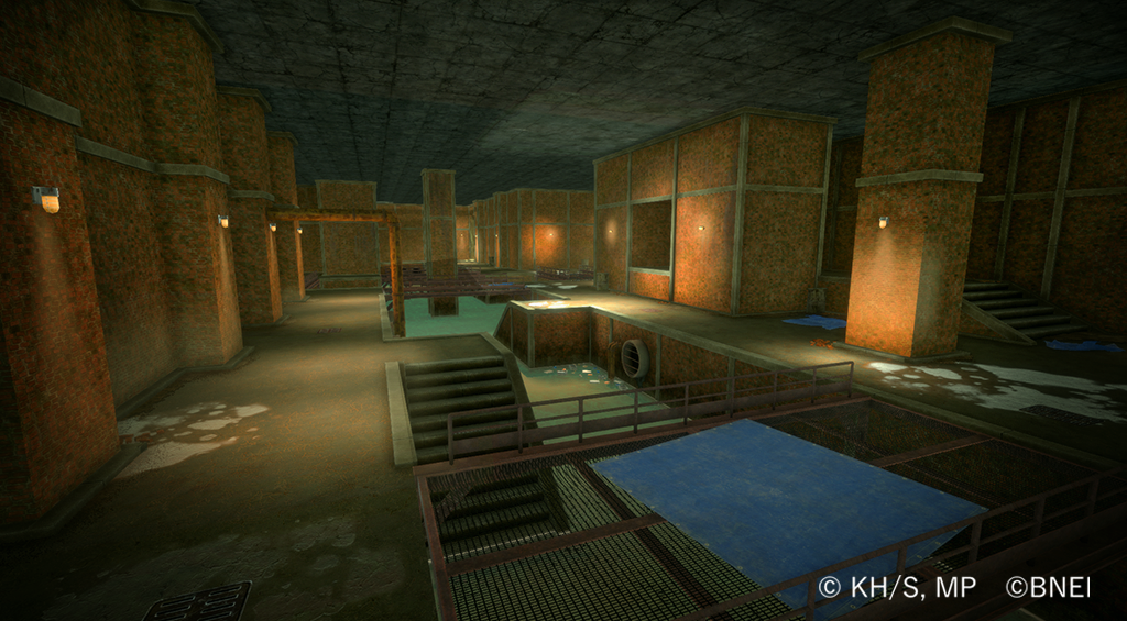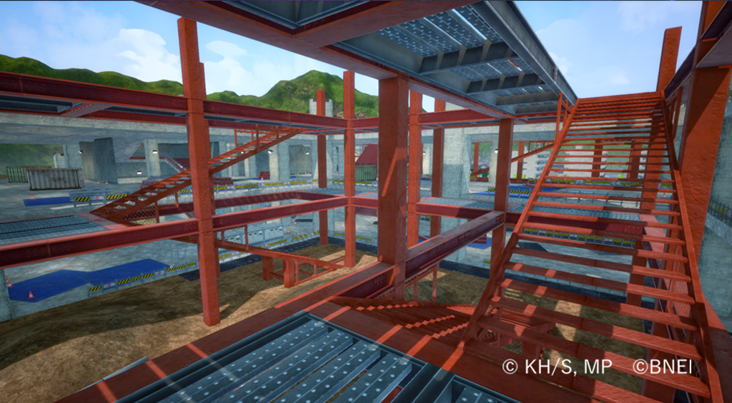 戦いによる建物の損傷表現や、床に空いた穴から見える怪しい地下研究所での戦闘が楽しめるエリア。