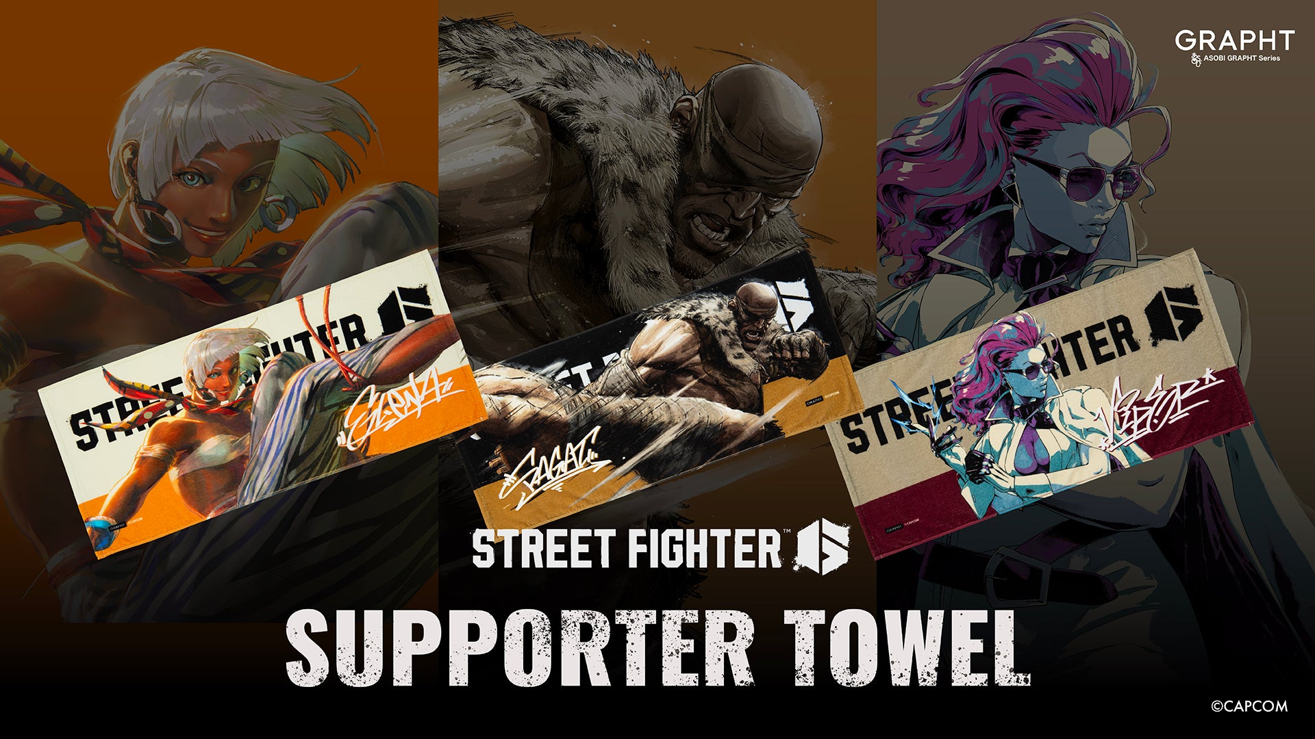 「ストリートファイター 6」とコラボレーションした『サポータータオル』は、本製品を加えて全30種のラインアップとなりました。格闘ゲームの大会・イベント会場はもちろん、配信視聴や自宅での観戦など、キャラクターやプレイヤーを応援するシーンを彩り、盛り上がりを後押しします。また大判サイズのタオルとして、日常のライフスタイルにも取り入れてお使いいただけます。