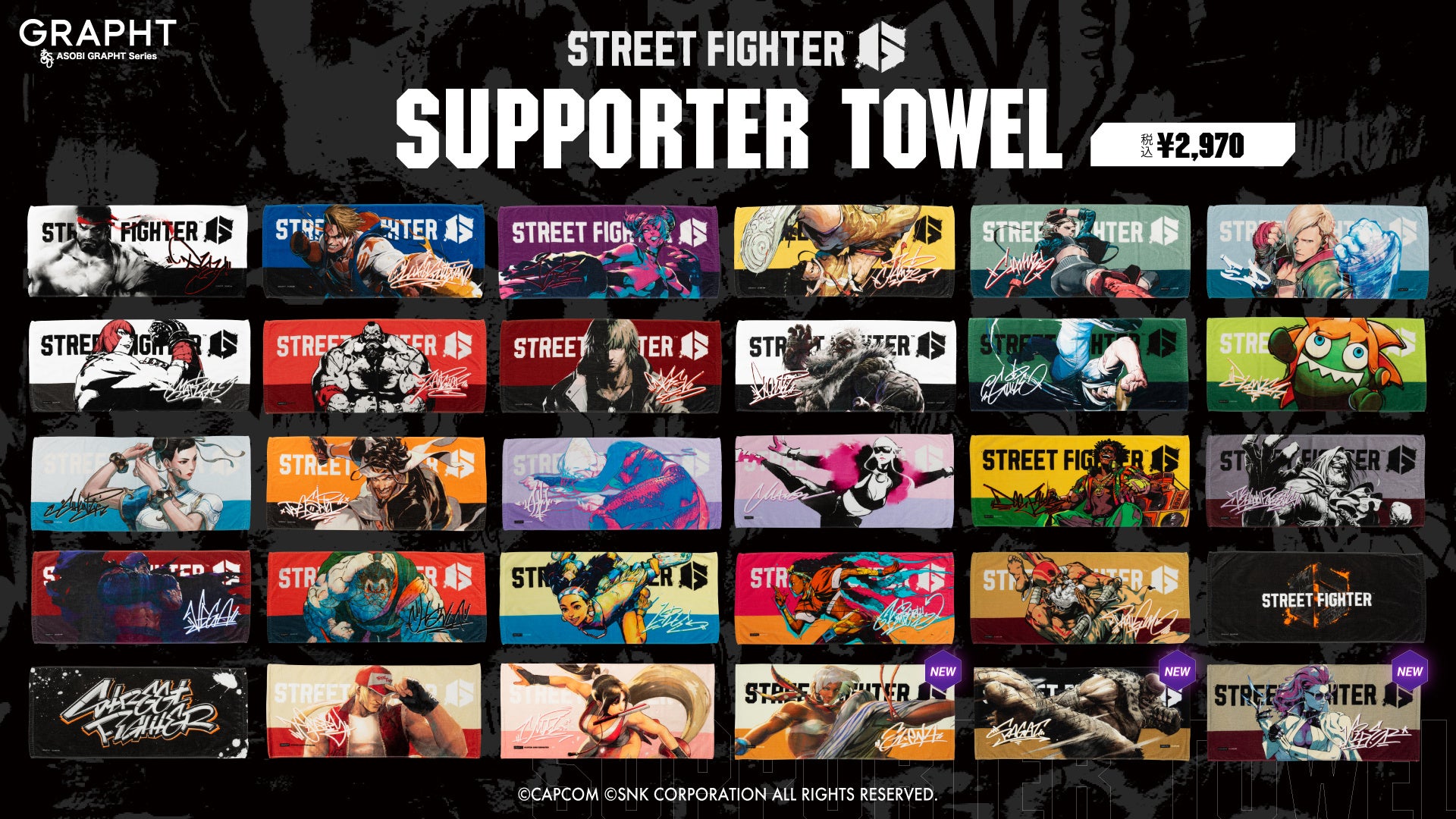 「ストリートファイター 6」とコラボレーションした『サポータータオル』は、本製品を加えて全30種のラインアップとなりました。格闘ゲームの大会・イベント会場はもちろん、配信視聴や自宅での観戦など、キャラクターやプレイヤーを応援するシーンを彩り、盛り上がりを後押しします。また大判サイズのタオルとして、日常のライフスタイルにも取り入れてお使いいただけます。