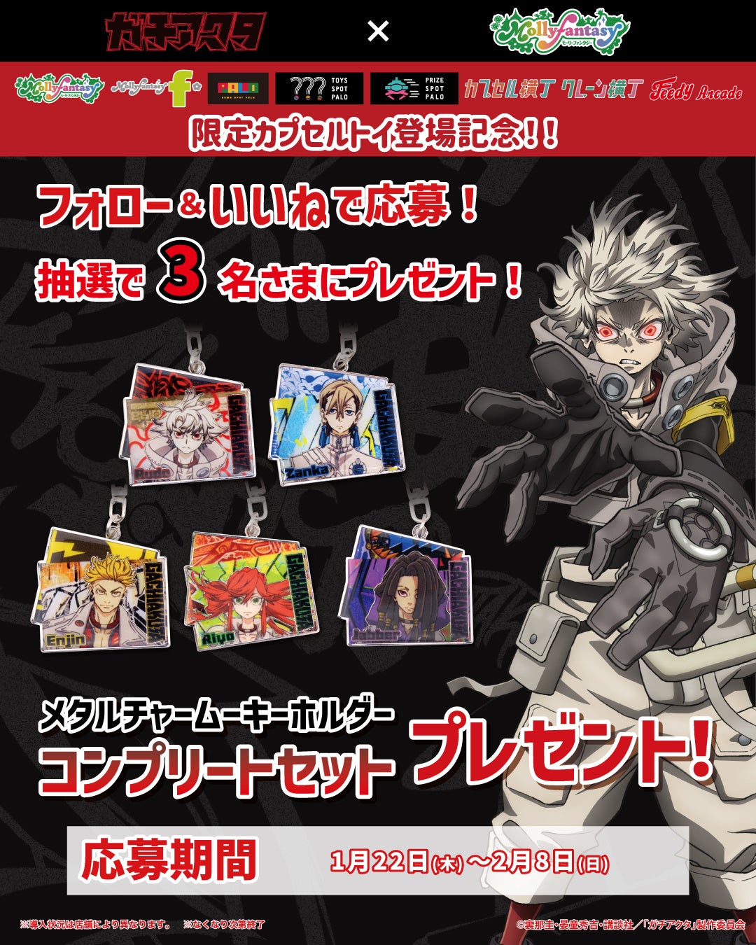 モーリーファンタジー公式X・Instagram の指定ポストをリポスト、またはいいねをしていただいた方の中から抽選で各3名さまに、「ガチアクタ メタルチャームキーホルダー コンプリートセット」をプレゼントいたします。詳細は公式アカウントをご確認ください。