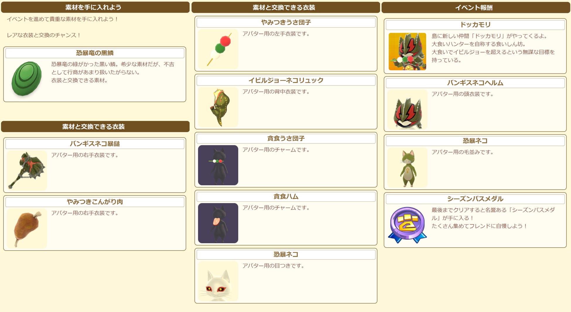 イベントに参加して新しい仲間「ドッカモリ」を島にお迎えしたり、「バンギスネコ暴鎚」などの豪華な報酬を獲得しよう!