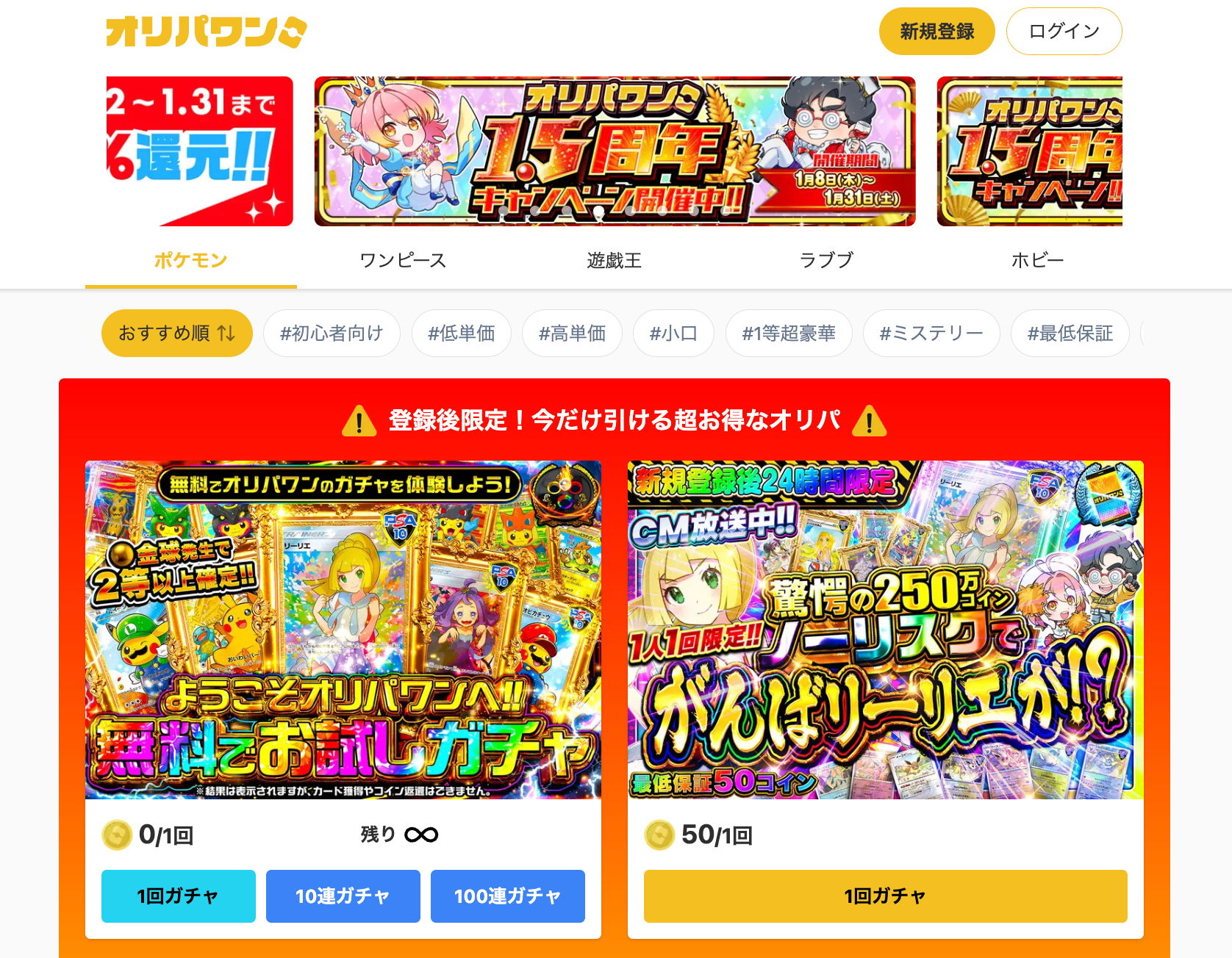 オリパワンは、オンラインで手軽にガチャを楽しめるオリパ専門サービスです。