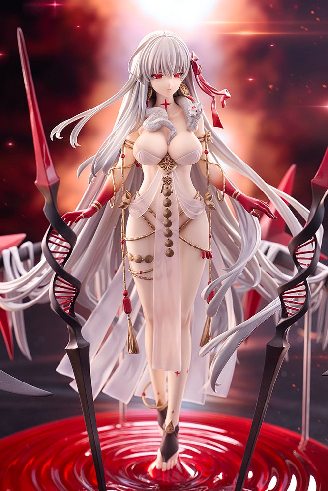 大迫力の神授兵装と抜群のプロポーションを忠実に再現。大胆すぎる衣装と全身を彩る装飾品、美しいラインを描く後ろ髪なども見どころです。台座は元イラストをイメージして水面に仕立てました。