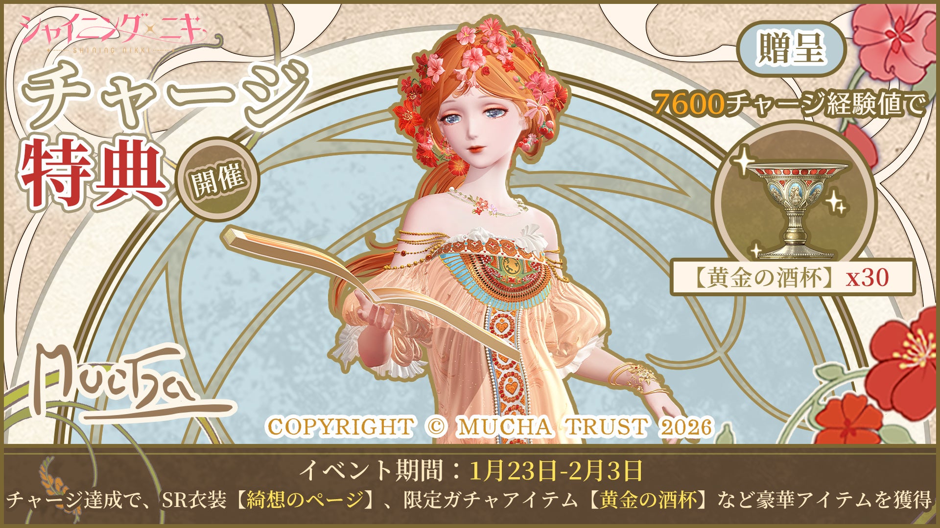 ■詳細:ミュシャをテーマのコラボ背景を使用した作品投稿で、シャイニングニキグッズやミュシャ公式グッズが獲得できるチャンスがあります!