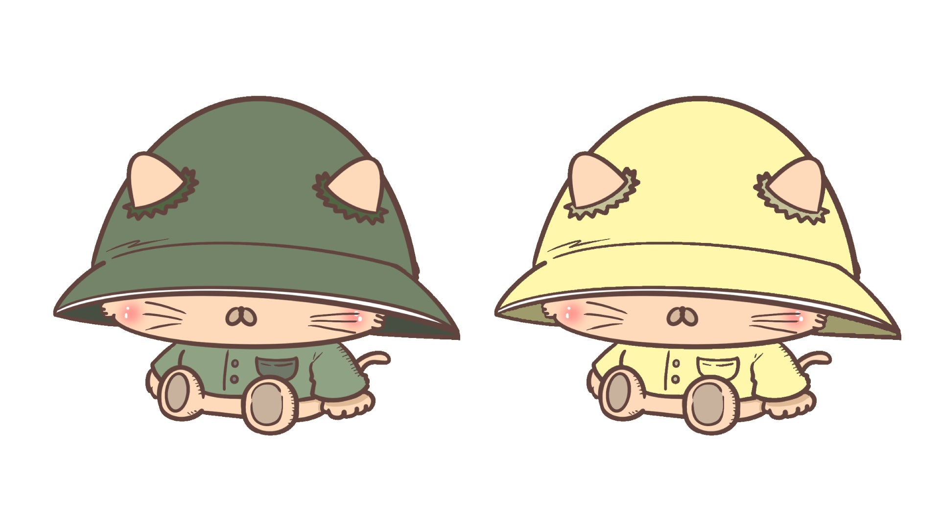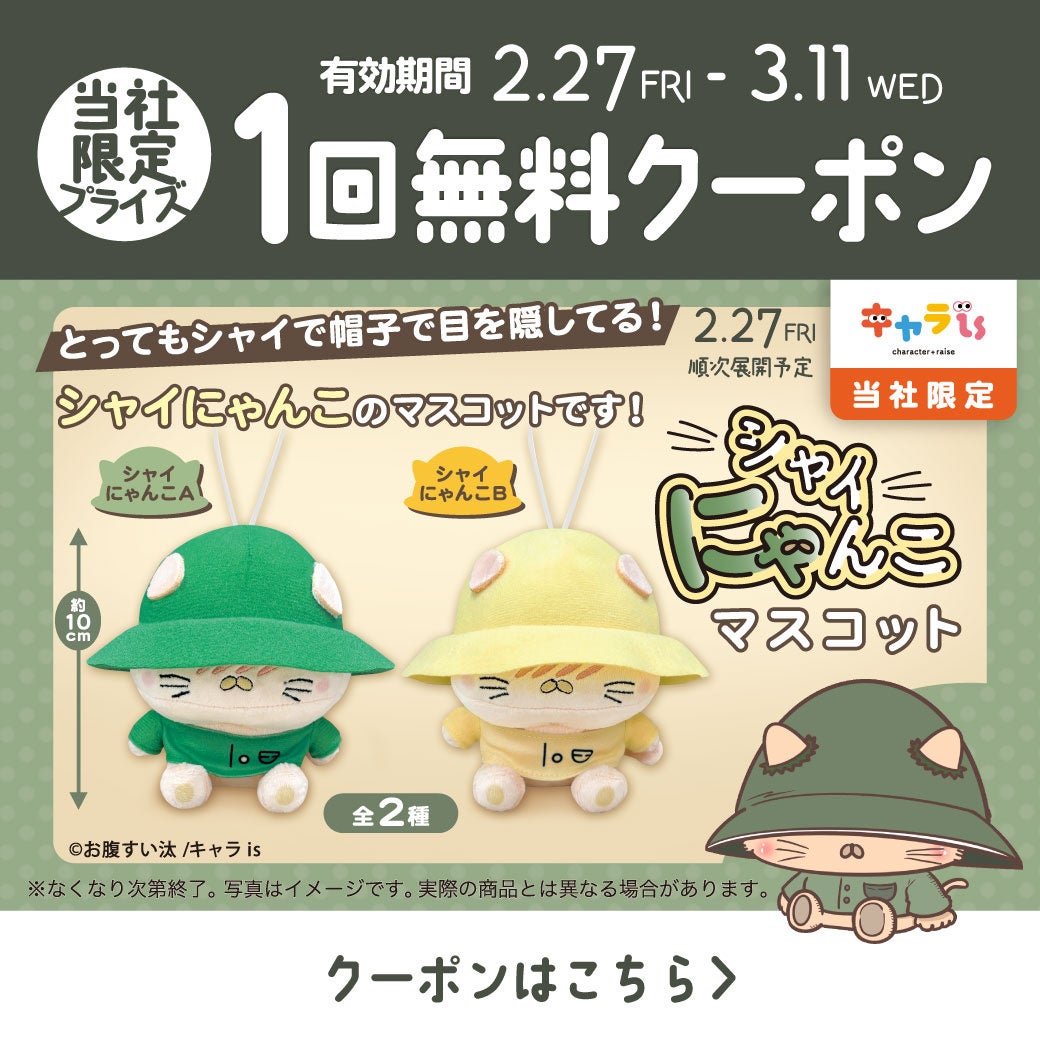 人間と目を合わすことができず帽子で目を隠しているとってもシャイな猫の「シャイにゃんこ」がぬいぐるみマスコットになって、当社限定でプライズ化!緑色と黄色の2種を展開いたします。