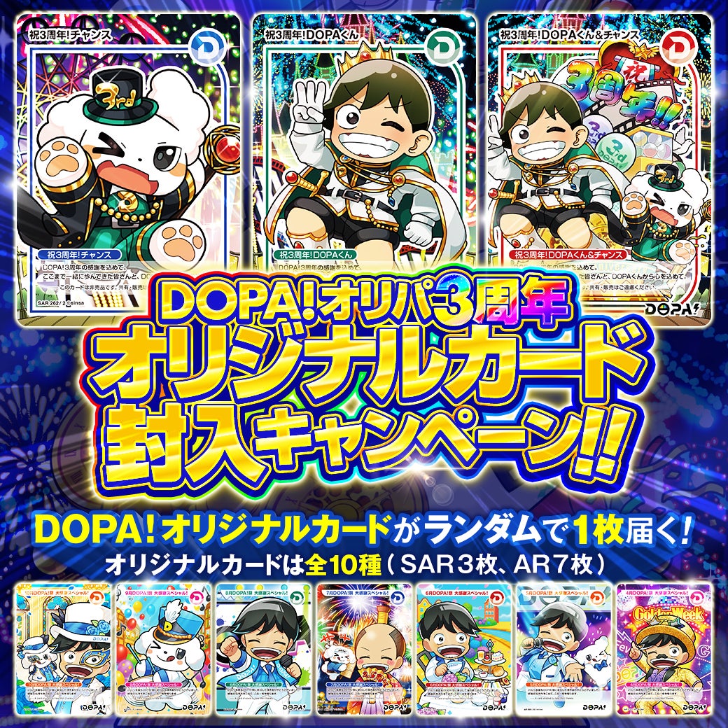 DOPA!は、サービス開始3周年を記念し、「DOPA!オリパ 3周年オリジナルカード封入キャンペーン」を開催いたします。