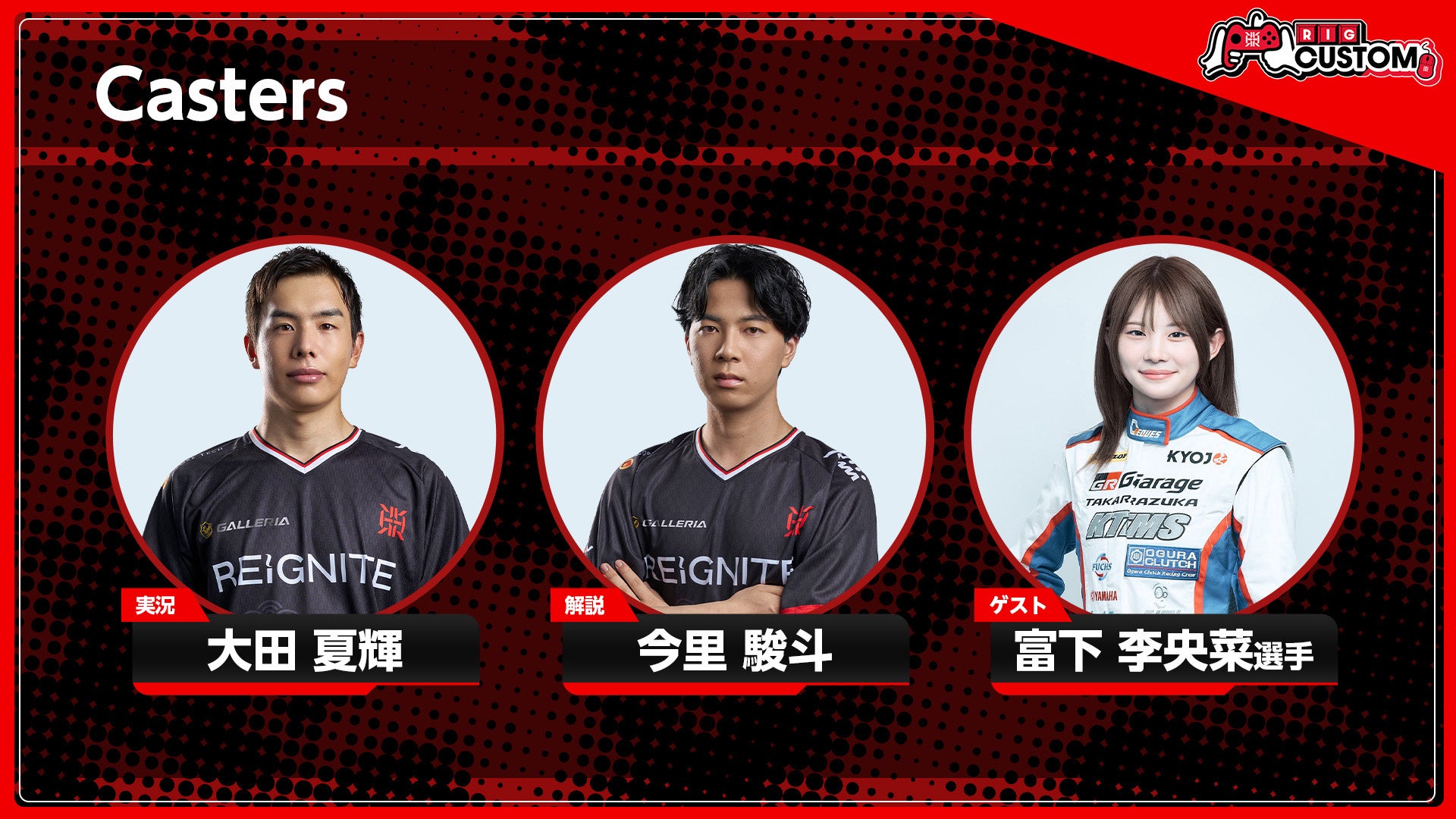 実況は同じくREIGNITEのe-Motorsports部門から「太田夏輝」が、解説は「今里駿斗」が務めます。