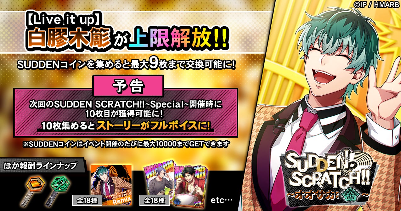 イベント期間中、KILLER SCRATCH!!をプレイするとライズ消費量に応じた確率でSUDDEN SCRATCH!!が発生します。SUDDEN SCRATCH!!をプレイすると、通常の報酬アイテムの他、限定アイテム「SUDDENコイン」を獲得することができます。「SUDDENコイン」を集めることで、「A.R.B remix」楽曲やレイズキー、オオサカ・ディビジョンのデコステッカーに使えるブースターなどと交換することが可能です。また、ストーリーカード「SSR【Live it up】白膠木簓」が上限解放され、最大9枚まで獲得できます。さらに、SUDDEN SCRATCH!!~Special~の開催時には10枚目が獲得可能となり、10枚集めるとカードストーリーがフルボイスに!詳細はアプリ内お知らせをご確認ください。
