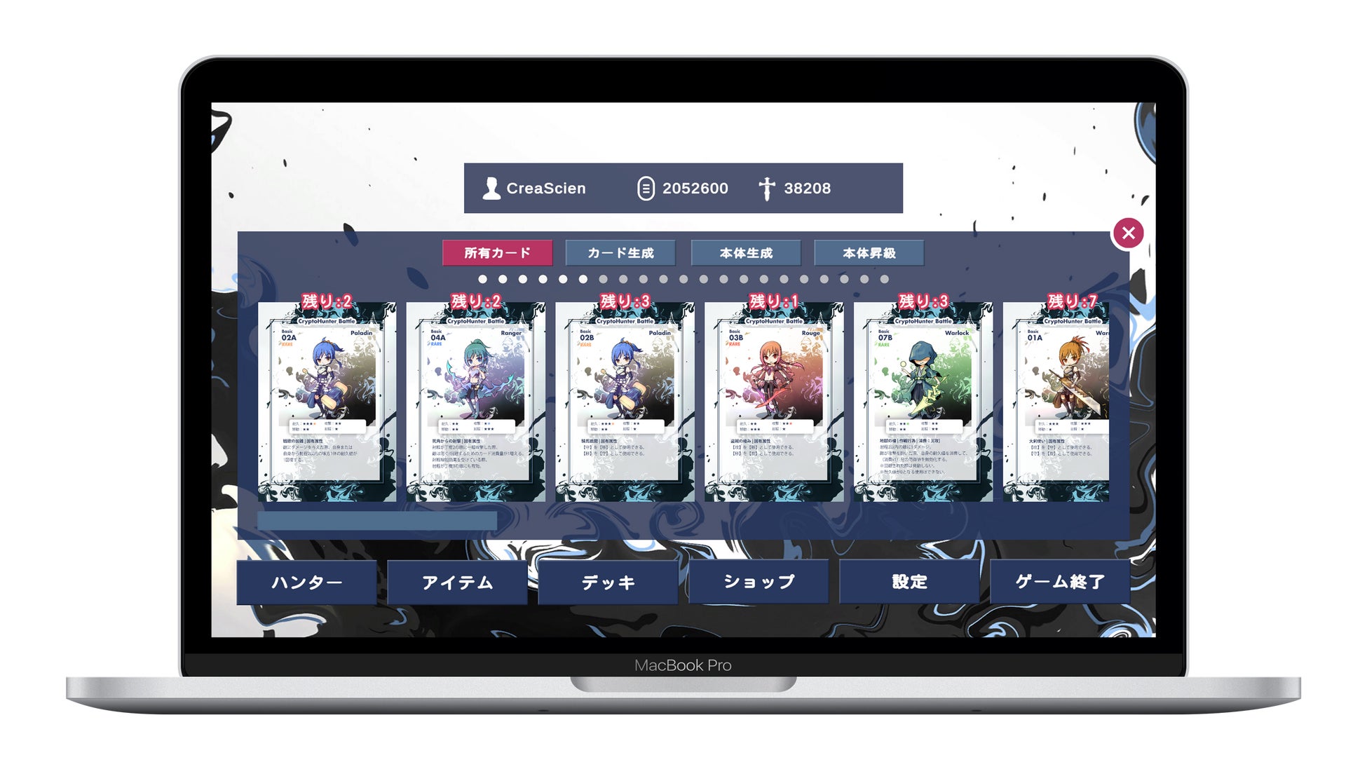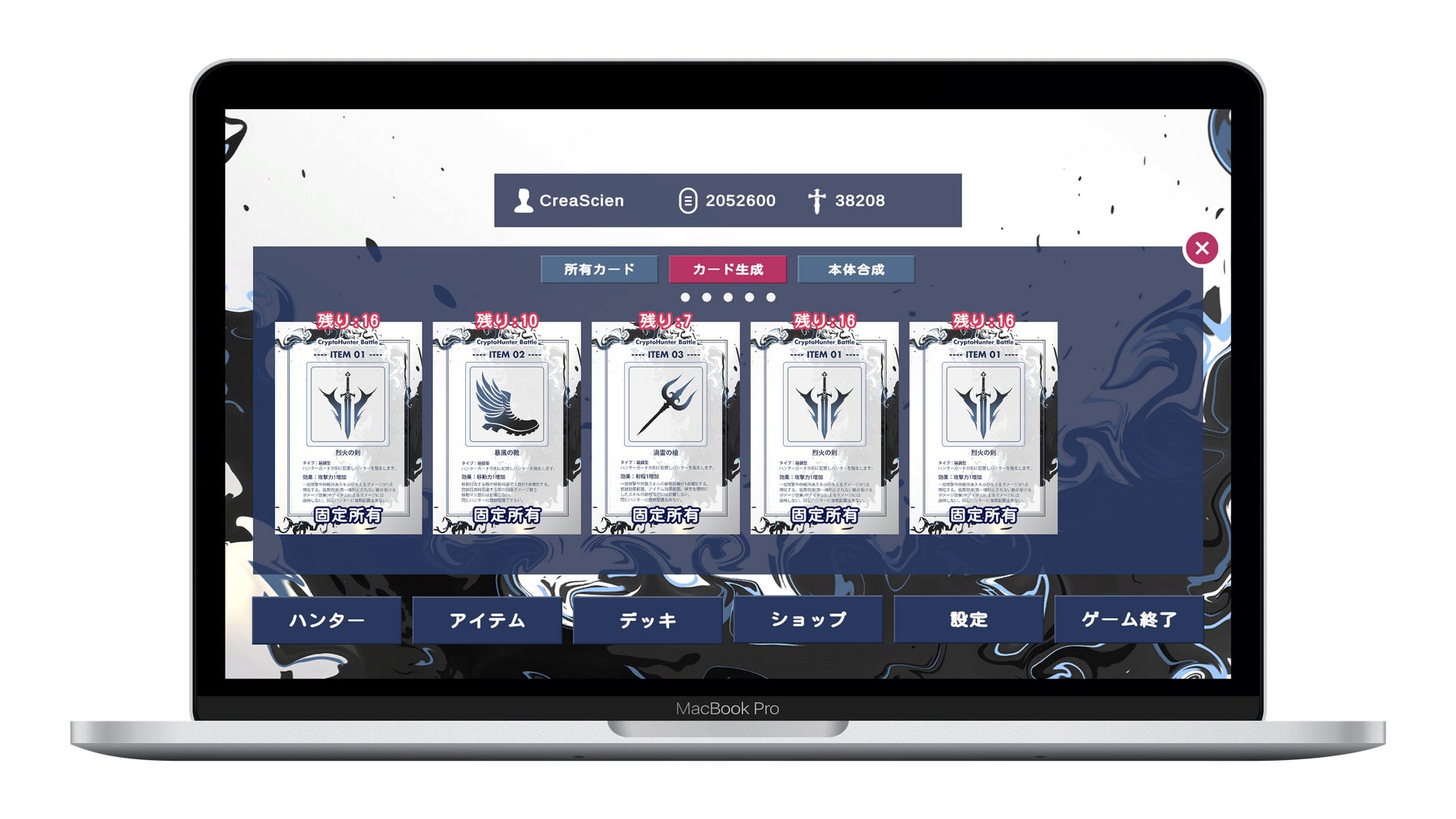 また、本体(カードの生成元)はゲーム内のガチャで小確率で獲得できるほか、NFTと紐づいており、第三者マーケットプレイスでユーザー間取引等ブロックチェーンゲームとしての特徴も持つ。