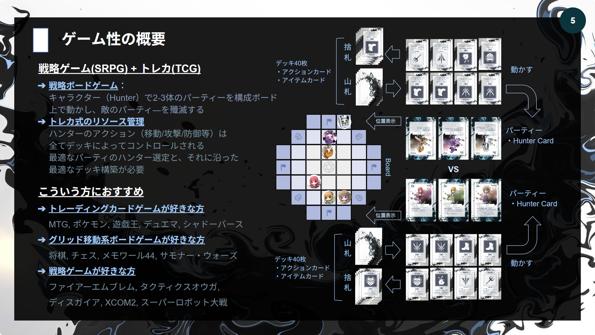 CryptoHunterはTCG(トレーディングカード)とタクティクス両方の要素を持った、カードゲーム式戦略ゲームです。デッキを構築して、デッキから引いた手札のカードをリソースとして、盤面上の戦闘ユニットを動かし、相手のユニットを殲滅する事が勝利条件となっている。