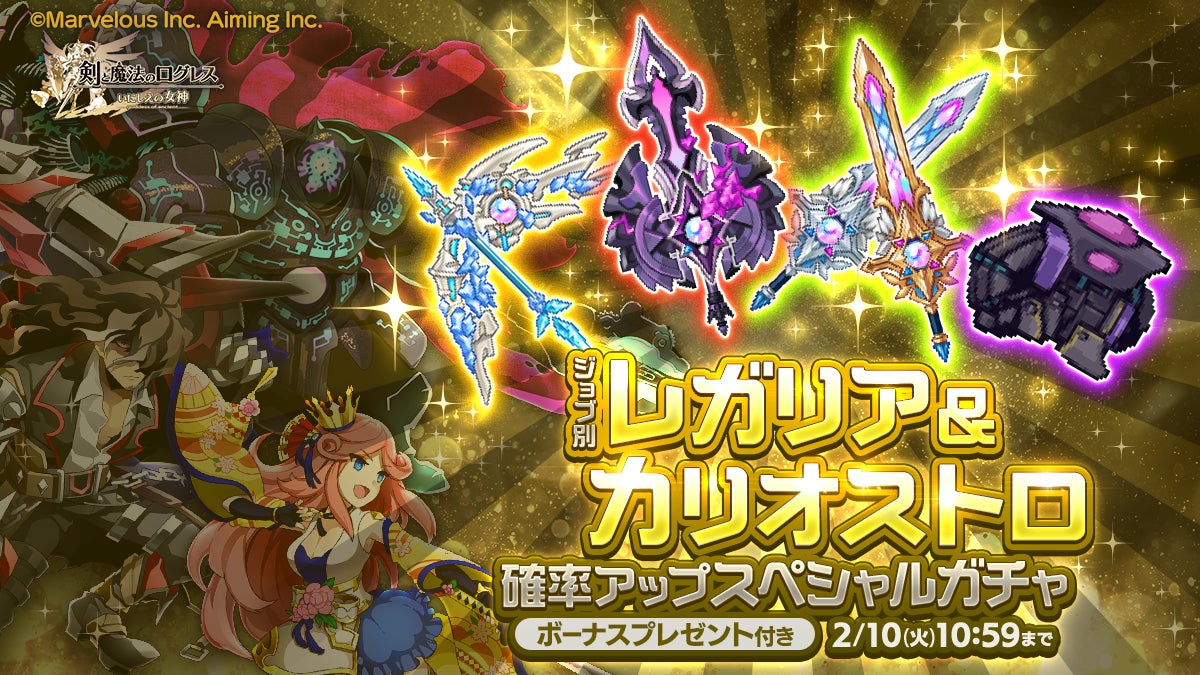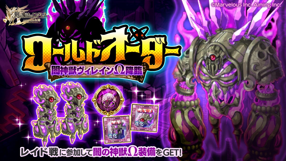 株式会社マーベラス(代表取締役社長:照井 慎一/所在地:東京都品川区)は、スマートフォン向け本格オンラインRPG『剣と魔法のログレス いにしえの女神』において、2026/1/28(水)に「ワールドオーダー 闇神獣ヴィレインΩ降臨」の開催、および「ジョブ別 レガリア&カリオストロ確率アップスペシャルガチャ」の販売を含むアップデートを行ったことをお知らせいたします。
