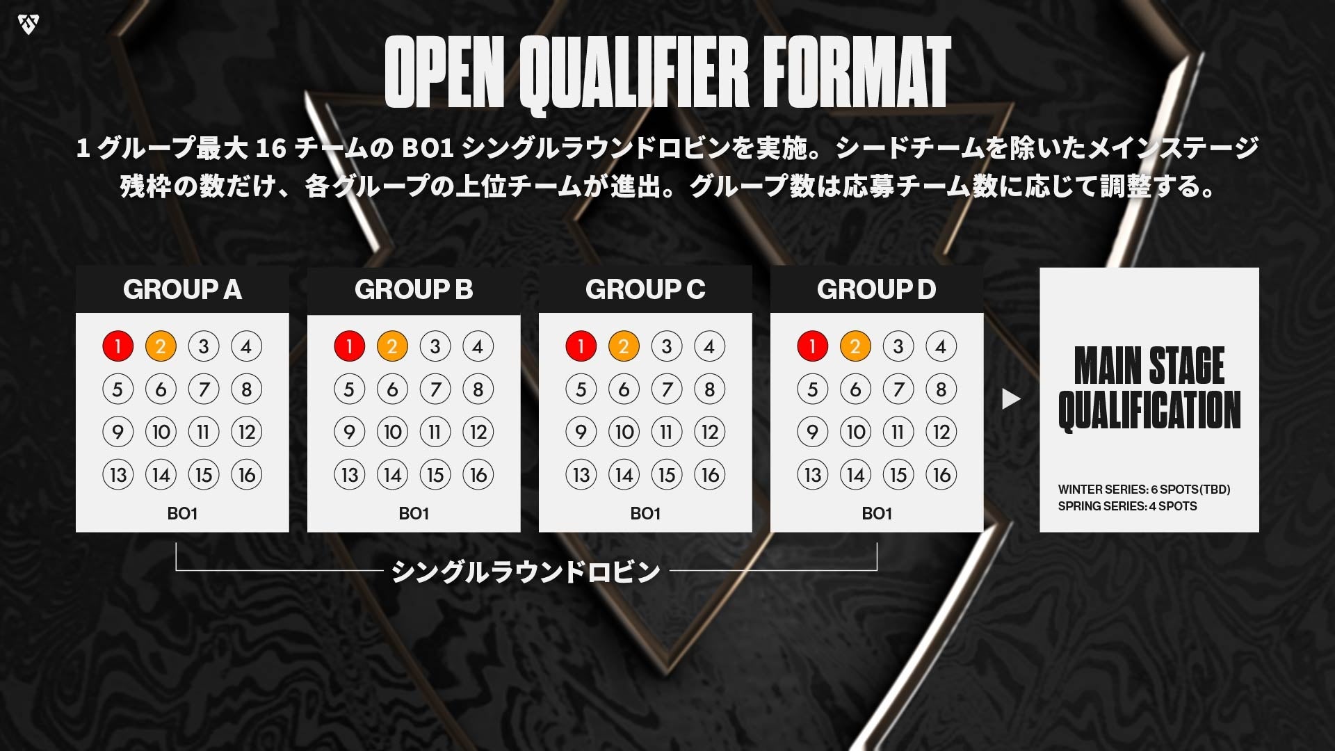 オープン予選を勝ち抜いた上位8チームが合流する「MAIN STAGE 1」から参戦する、シード4チームが以下の通り決定いたしました。