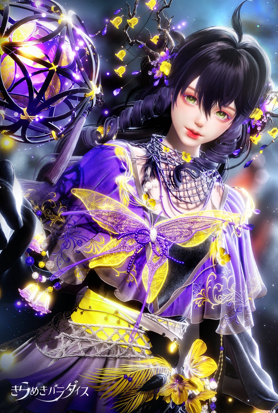 ワンピースでは「静止した衣装の動的表現」という難題に挑みました。蝶の装飾の中央にある紫色の宝石は、透明感ある屈折表現に加え、自発光効果を付与したことで、常に微細な粒子を放出し、まるで蝶が羽ばたくたびに粉を散らすかのような神秘的な輝きを放つことができます。