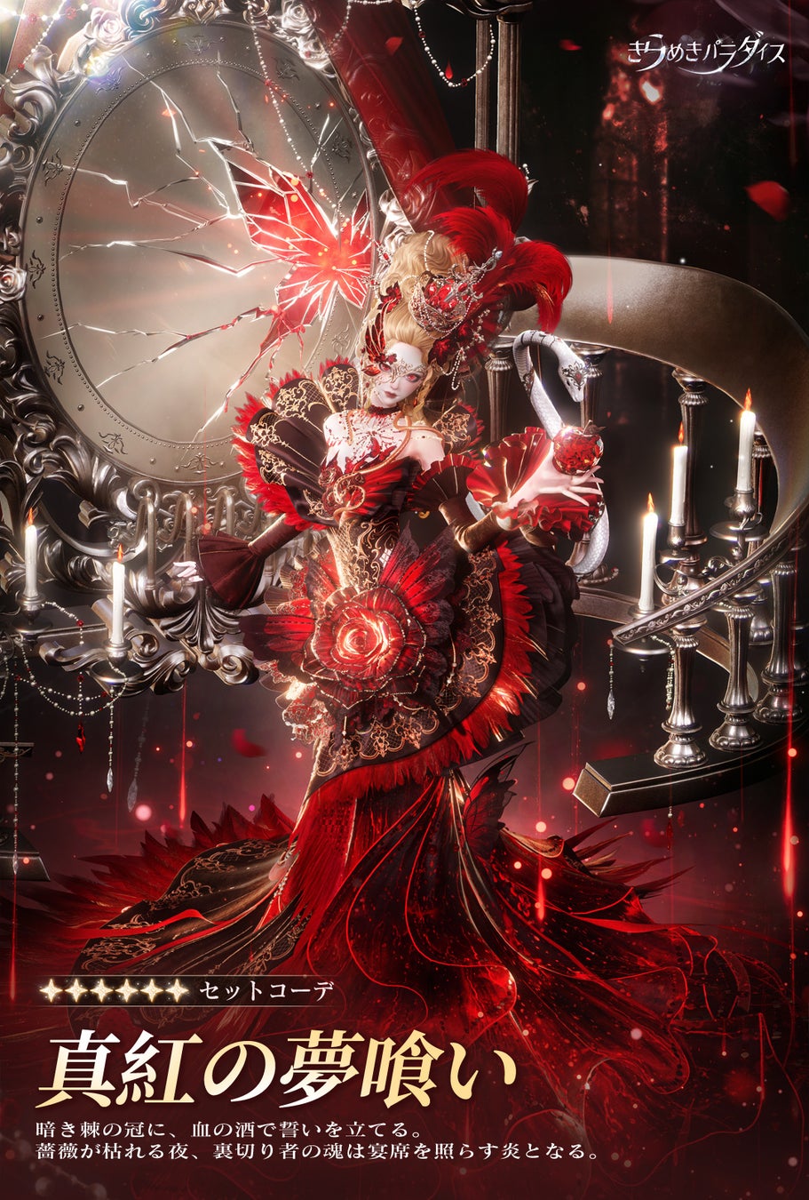 本日、『きらめきパラダイス』の新バージョン「緋色の悪夢」が正式に公開されました!今回のアップデートでは、ブラッディ・マリーのヨーロッパ伝説をモチーフに、ルネサンス貴族のファッションと複数の象徴を融合させた新しい星6セット『真紅の夢喰い』、山の精霊をテーマに無形文化遺産の滾灯技術や高山植物の要素を取り入れた星5セット『鈴夢の音』、新星4セット『ラインの序曲』、SSR絆『シュウ-耽溺』、さらに新システムや多彩なイベントも登場!ダークでスリリングな世界観と、伝統の温かみが融合した新たな旅に、ぜひ参加してください。夜の帳を契りとし、共に新たな黎明を迎えよう!