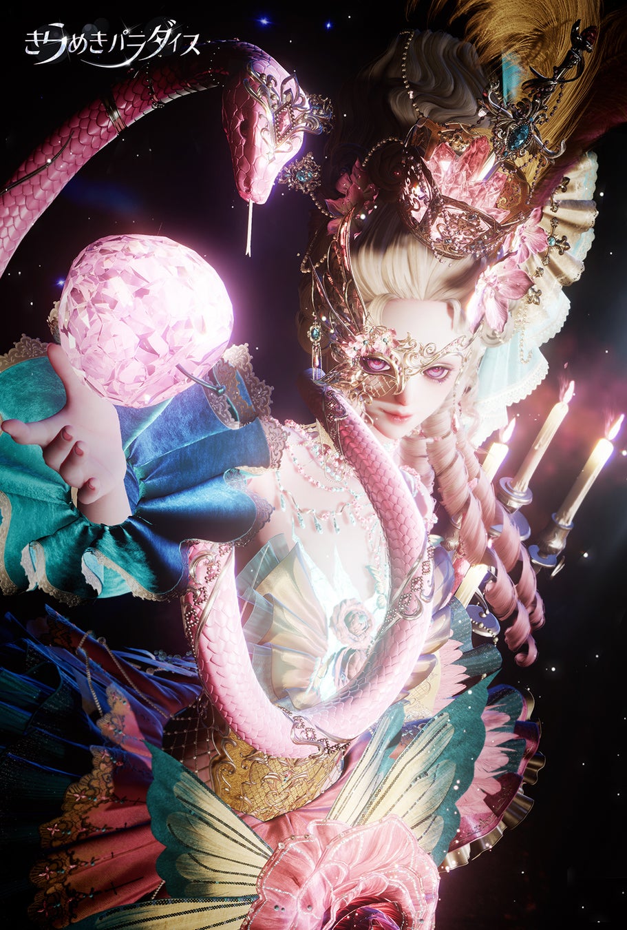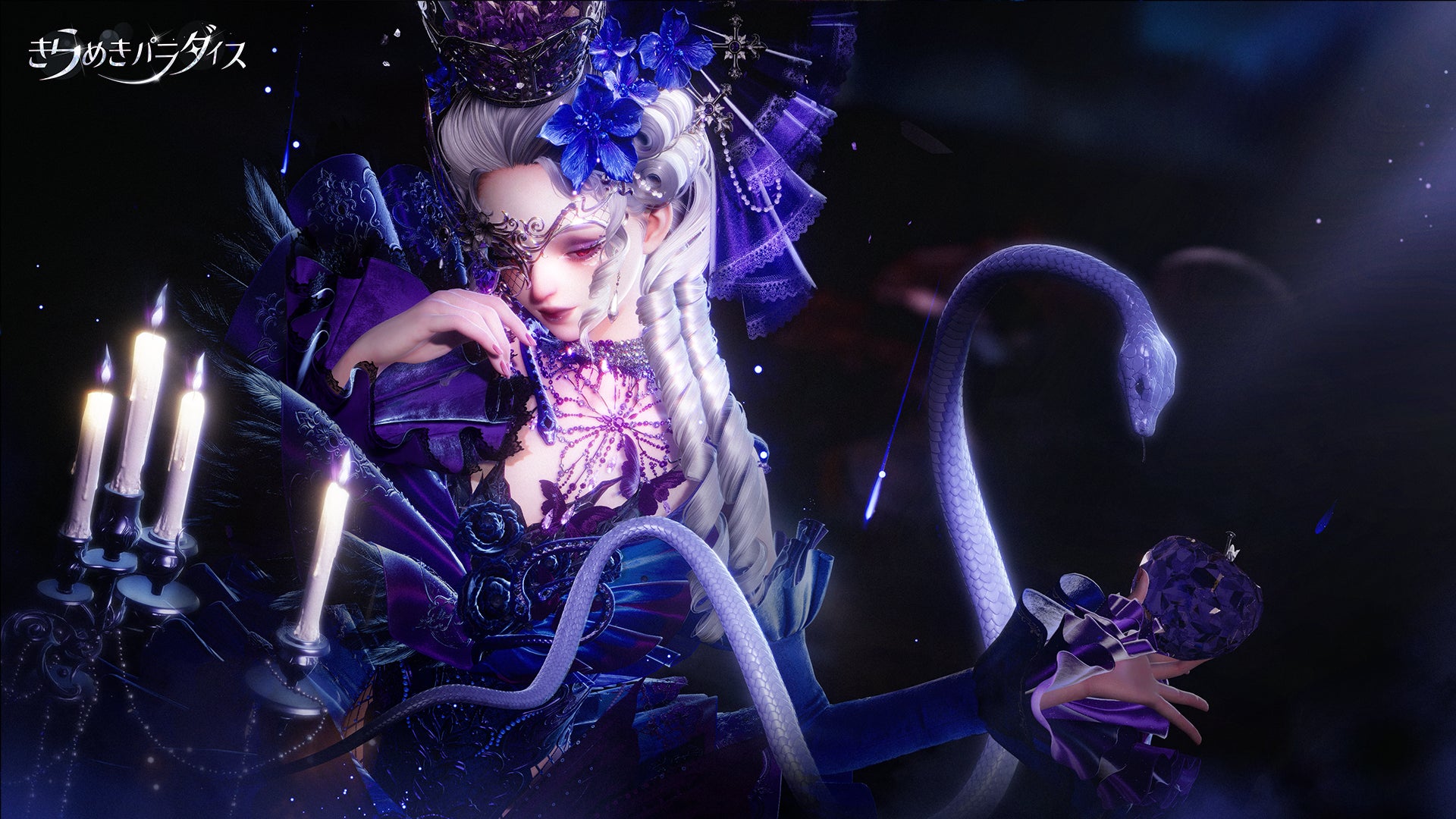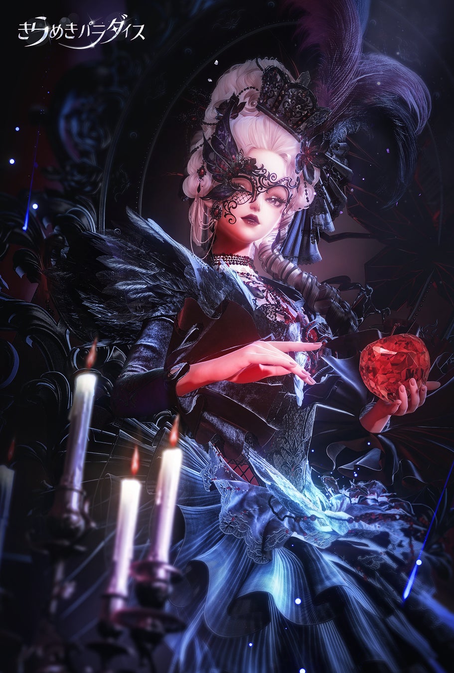 スカートの上部には絶えず滴る液体のエフェクトがあり、抑制されつつも途切れることなく流れ続ける様は、まるで止まらないささやきのように見えます。髪飾りや面飾りからは花びらが芯からゆっくりと小さいながらも絶え間なく舞い散り続け、まるで見えざる力に包まれているかのような演出となっています。背後に浮かぶ蝋燭はただの装飾ではなく、動きに合わせて火が微かに揺らめく仕様となっています。
