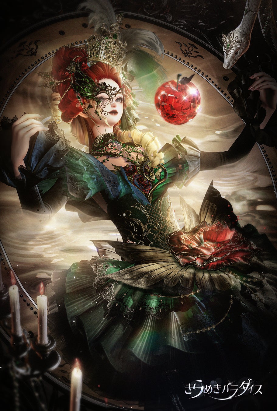 白蛇は体に巻き付き、垂れ下がった蛇の胴体にはリンゴが吊るされ、エデンの園の寓意である貪欲や誘惑、避けられない選択を象徴しています。首元から染み出る液体は断ち切られた首筋を飾る首飾りとして、断首の歴史を暗示したものとなっています。胸部の裂けた肌の中には、心臓の代わりに赤い宝石が宿り、割れ目からは花や蝶が芽吹き、蛇がその縁を這い回ることで、美しさと危険が共存する世界を表現しています。