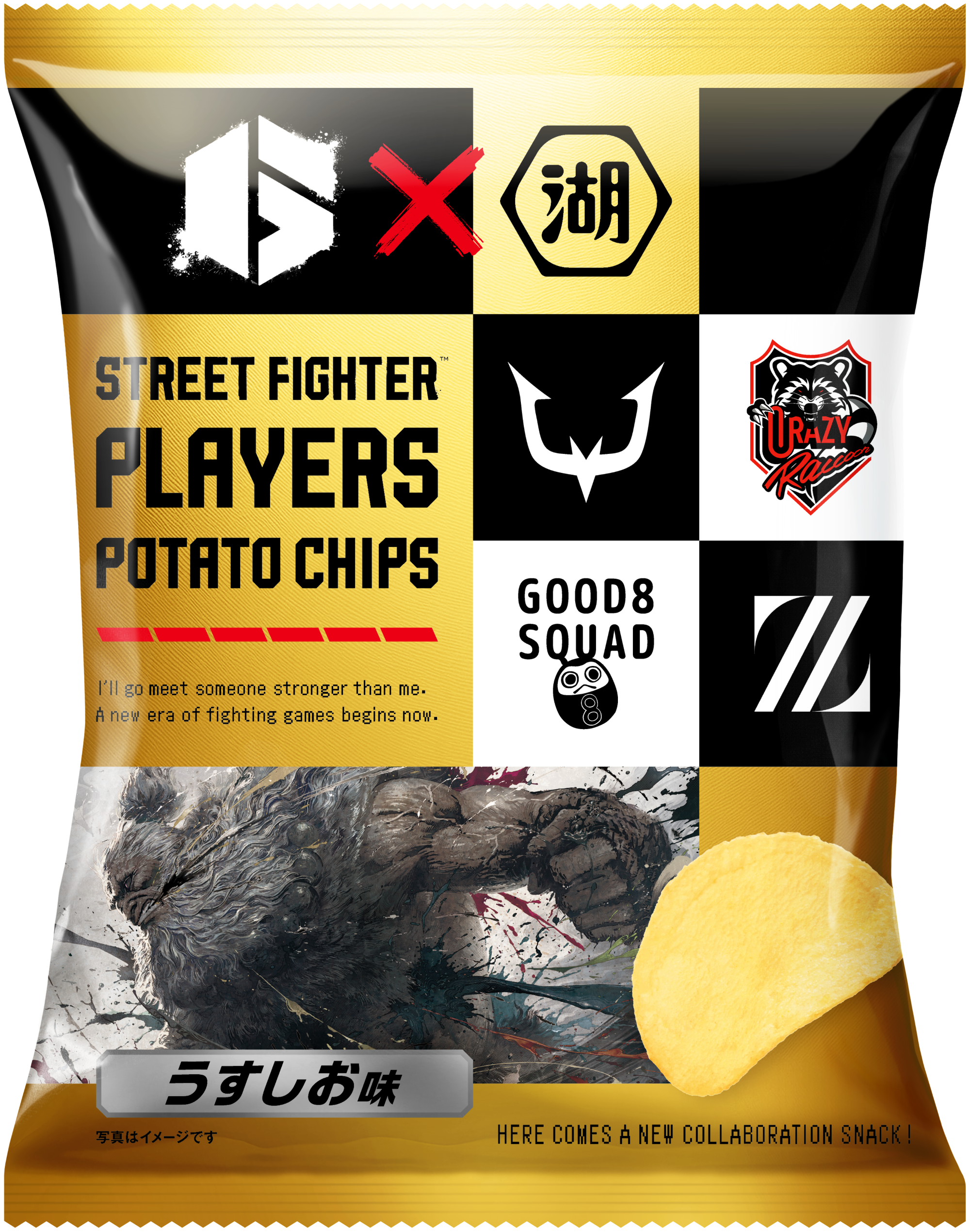 「ストリートファイタープレイヤーチップス」は定番の「うすしお」味! 各eスポーツチームのロゴをパッケージにあしらったスタイリッシュなデザインとなっている。