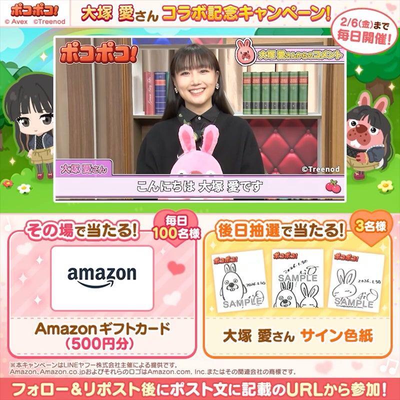 期間中、「LINE ポコポコ」の公式X(旧Twitter)アカウントをフォローしてキャンペーンポストをリポストすると、Amazonギフトカード(500円分)や大塚 愛さんのサイン色紙などの豪華賞品が抽選で当たります。