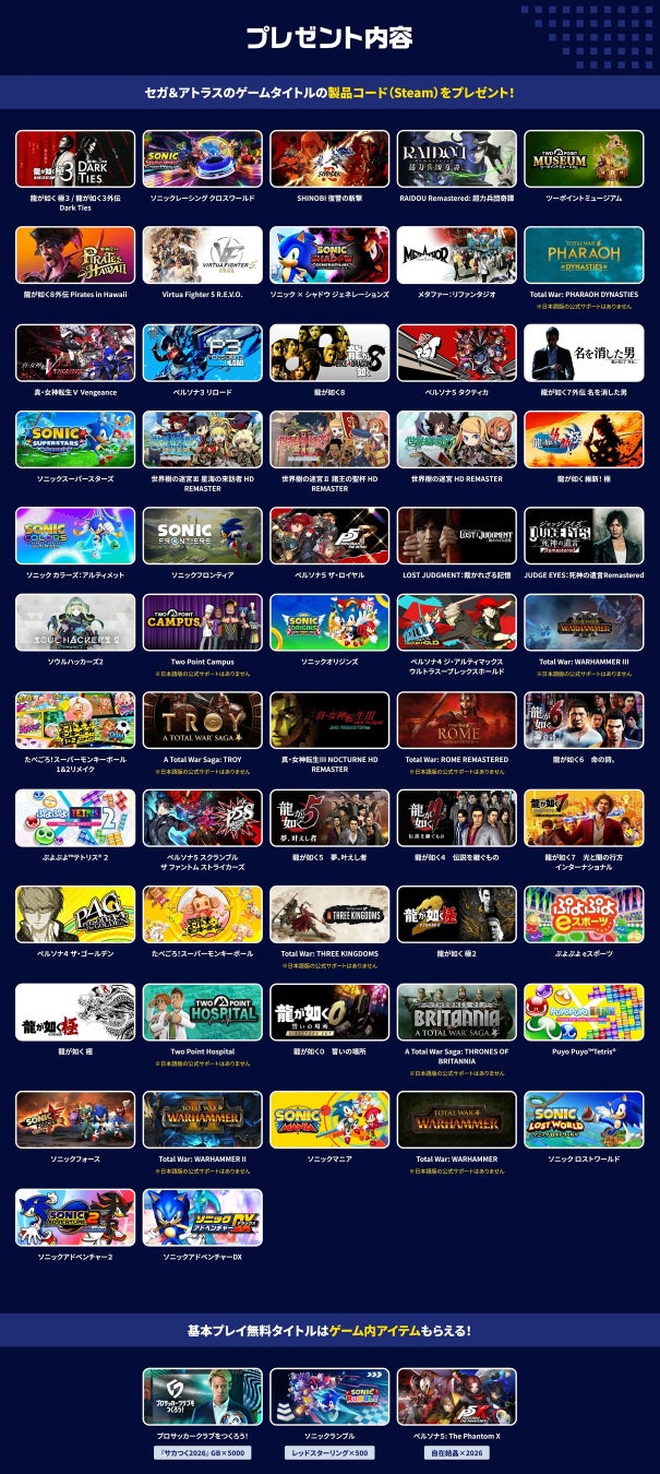 YouTube、TikTok、Twitch、X(エックス)で配信対象タイトルのプレイ動画をアップし応募した方全員に、セガ/アトラス60タイトルの中からお好きなゲームコードやゲーム内アイテムをプレゼントします。プレゼントの獲得にはプラットフォームごとに一定の達成条件があり、各プラットフォームの達成条件を達成すると、60タイトルすべてのプレゼントと、「東京ゲームショウ2026(TGS2026)」およびTGS2026前夜にセガが開催する「SEGA TGS PARTY」へご招待いたします。また、Wチャンスとして応募者全員の中から抽選でゲーミングPCをはじめとした「最新配信ギア」を3名様、Steamギフトカードを100名様にプレゼントします。詳細はキャンペーンページをご確認ください。