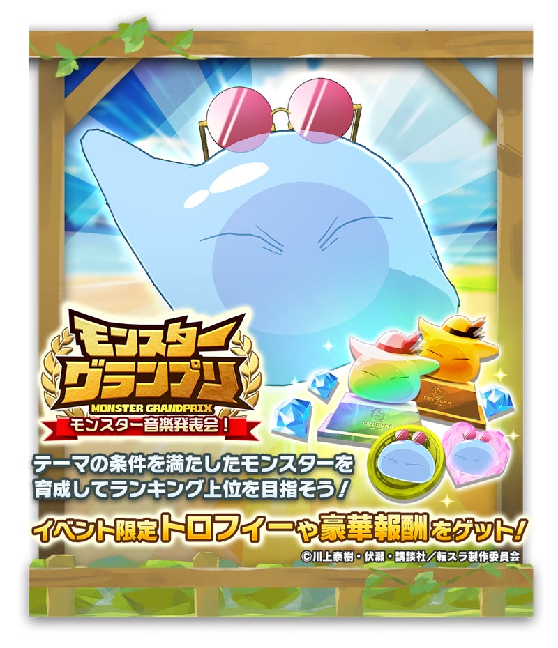 「モンスターグランプリ モンスター音楽発表会!」を開催します。前半、後半で3つずつ用意されたテーマに沿ってモンスターを育成完了し、「いいね(総合力を元にしたポイント)」でランキングを競います。月の前半、後半を合算した総合ランキングにより獲得できる専用トロフィーには総合ランキングの順位が保存され、いつでも確認することができます。イベントの詳細はゲーム内にてご確認ください。