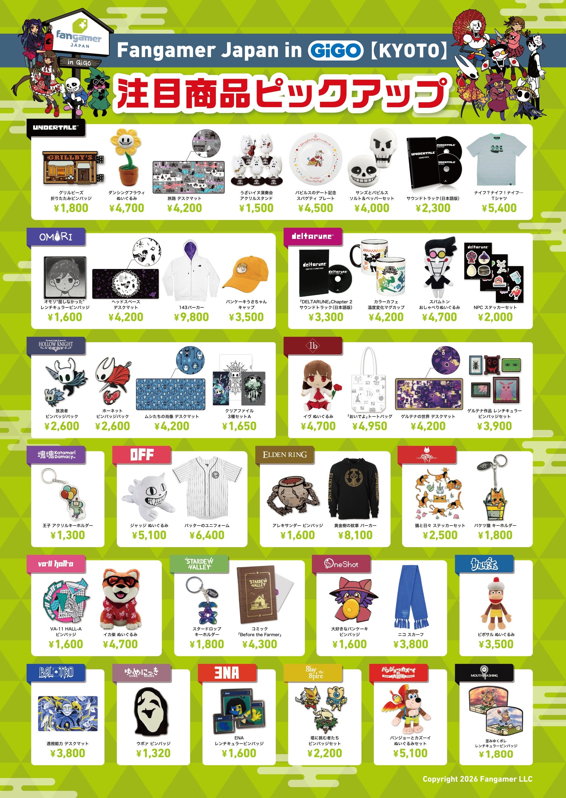 株式会社GENDA GiGO Entertainment(本社:東京都港区 代表取締役社長:二宮 一浩、以下「当社」)は2026年1月31日(土)、「GiGO(ギーゴ)河原町オーパB1F」に、国内2店舗目のゲームグッズショップ「Fangamer(ファンゲーマー) Japan in GiGO【KYOTO】」をオープンいたします。