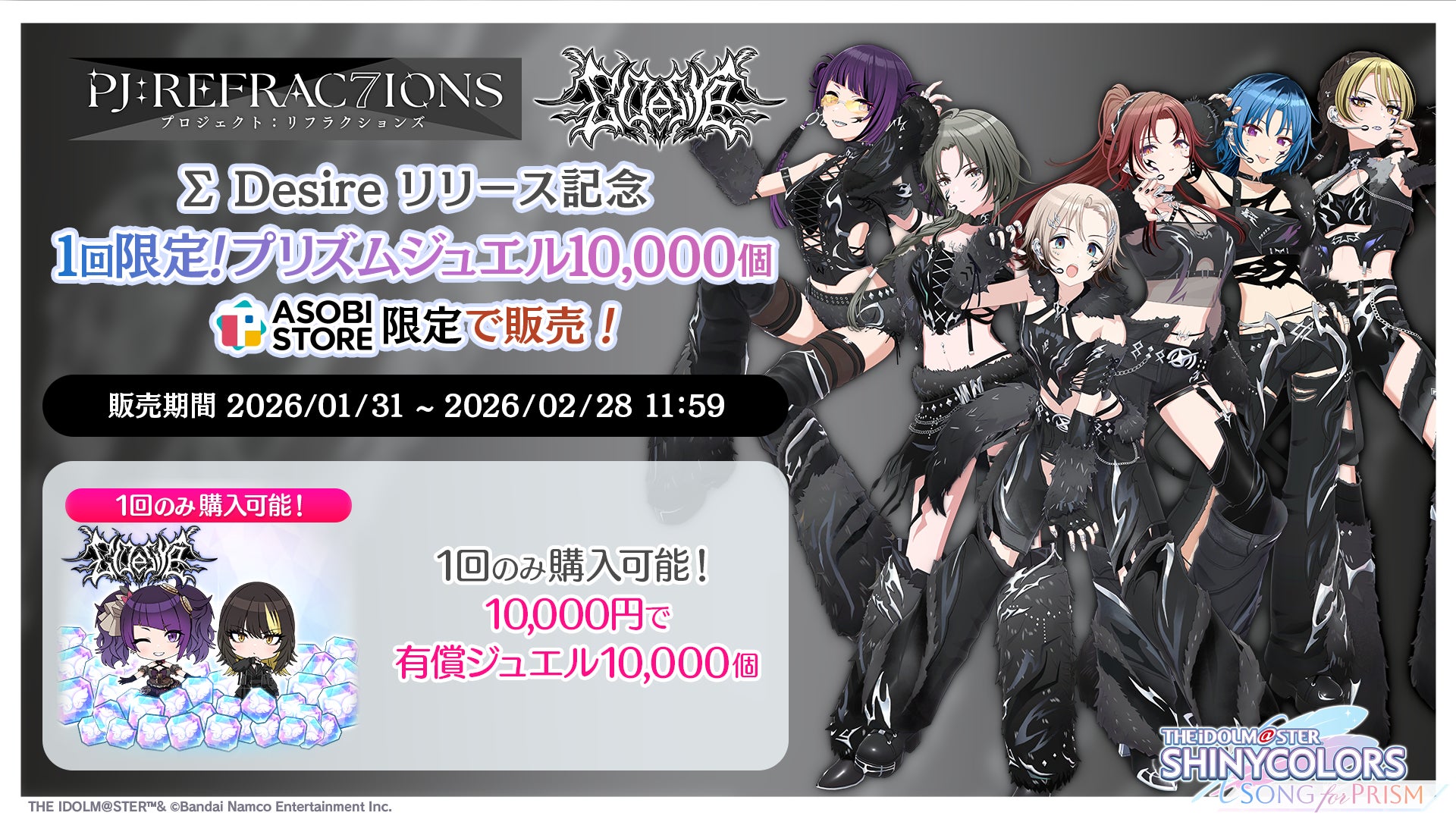 ただいま新ユニット ∑ Desire の登場を記念して、「∑ Desire リリース記念 1回限定!プリズムジュエル 10,000個」をASOBI STORE限定で販売中です。