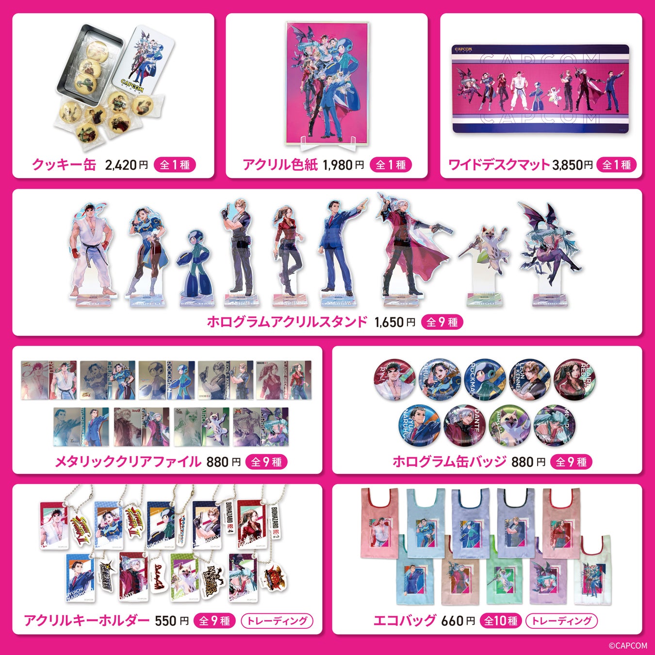 本商品は、カプコンの人気7タイトルより選出した9キャラクターを描き下ろした特別なイラストを使用した商品シリーズです。