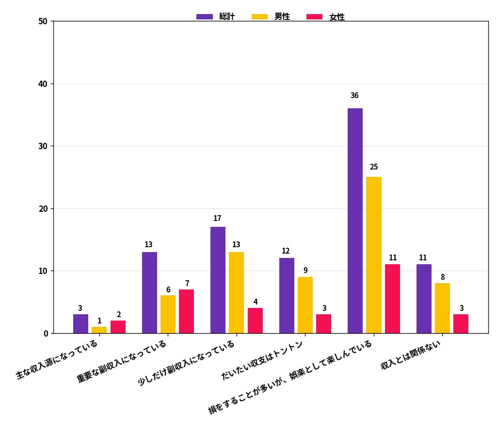 全体として、パチンコは多くの回答者にとって収入源というより娯楽として位置づけられています。最も多いのは「損をすることが多いが、娯楽として楽しんでいる」で、92人中36人(39.13%)を占めています。また、「だいたい収支はトントン」と答えた人も12人(13.04%)おり、金銭的な影響が大きくない層が一定数存在します。これらを合わせると、全体の半数以上(48人、52.17%)がパチンコを収入とは切り離して捉えていることが分かります。一方で、副収入になっていると回答した人は33人(35.87%)で、その内訳は「少しだけ副収入になっている」が17人(18.48%)、「重要な副収入になっている」が13人(14.13%)となっています。「主な収入源になっている」とする人は3人(3.26%)にとどまり、全体としてパチンコは収益目的よりも娯楽としての性格が強いことが示されています。