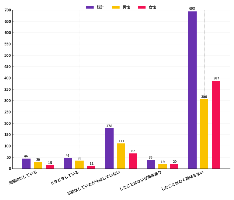 オンラインを含むパチンコの経験について見ると、「したことはなく、興味もない」と答えた人が69.3%と圧倒的に多く、そもそもパチンコに関わっていない人が大多数を占めています。「したことはないが、興味はある」は3.9%と少数で、新たに始めたいと考えている人は多くないようです。