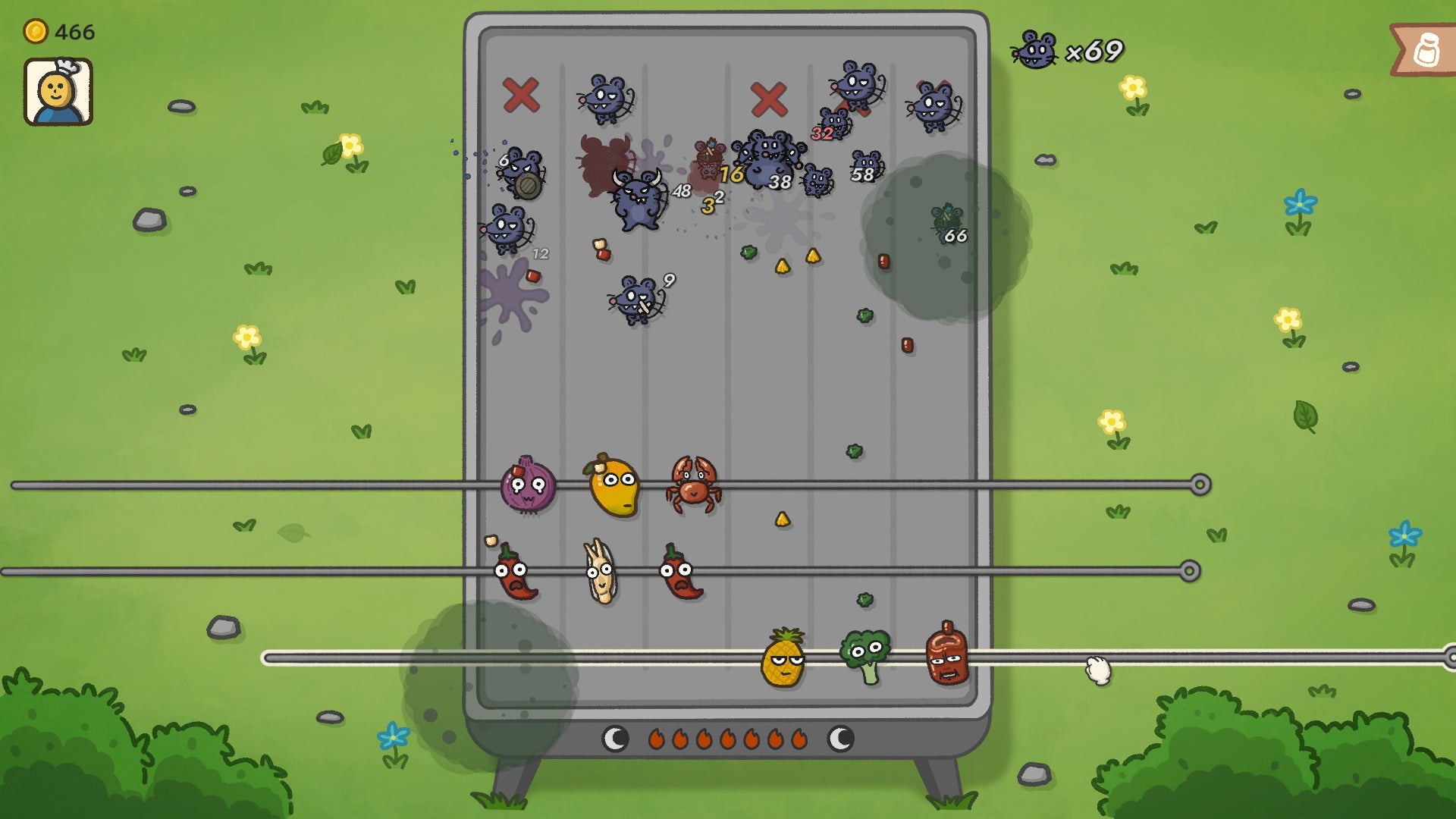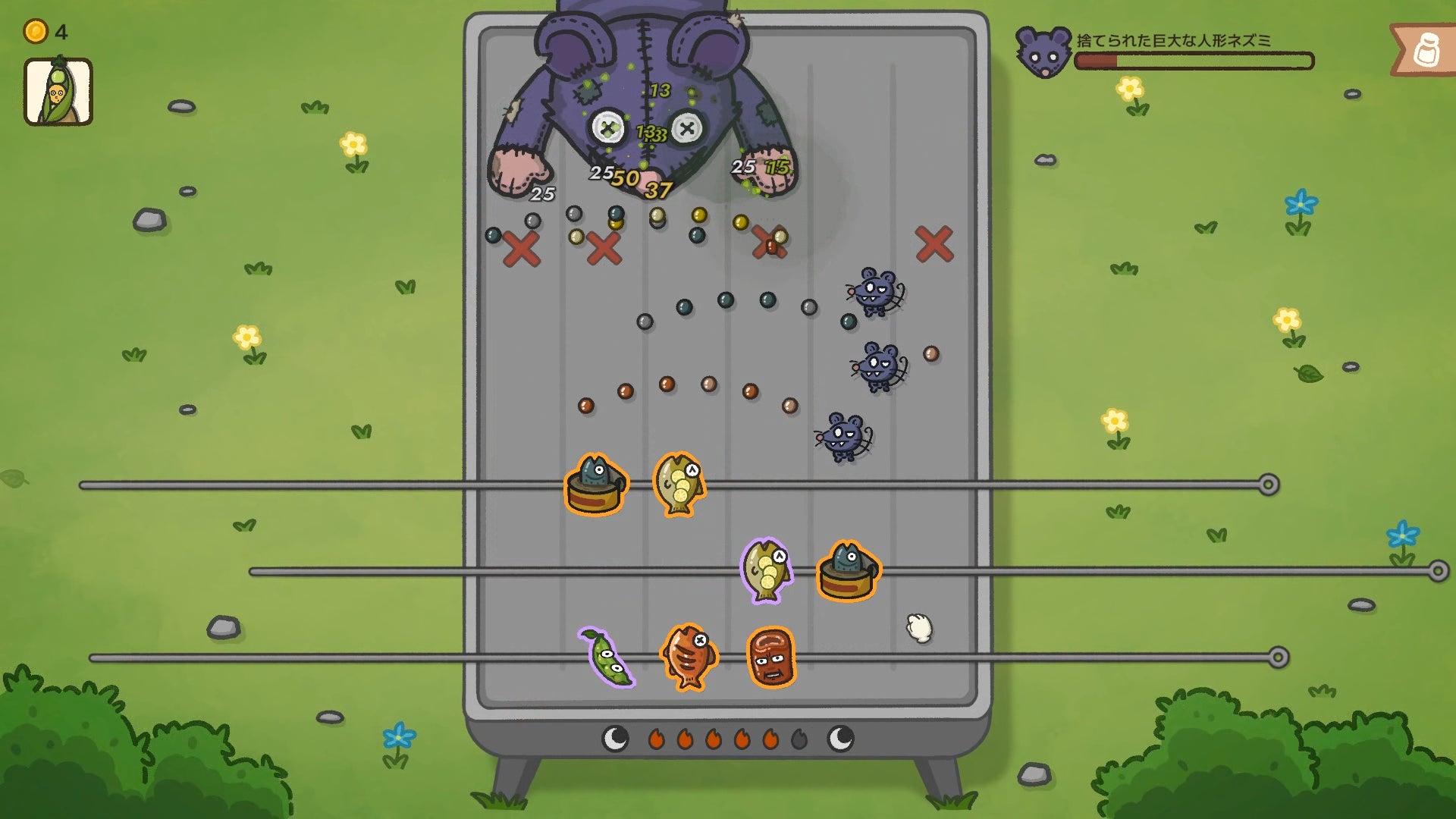 串焼きをドラッグするだけで弾を発射し、ネズミを撃退できます。串焼きの弾には、シュート、反射、範囲攻撃など複数の挙動があり、プレイヤーは自分の好みに合わせて、様々な戦術を組み立てることが可能です。