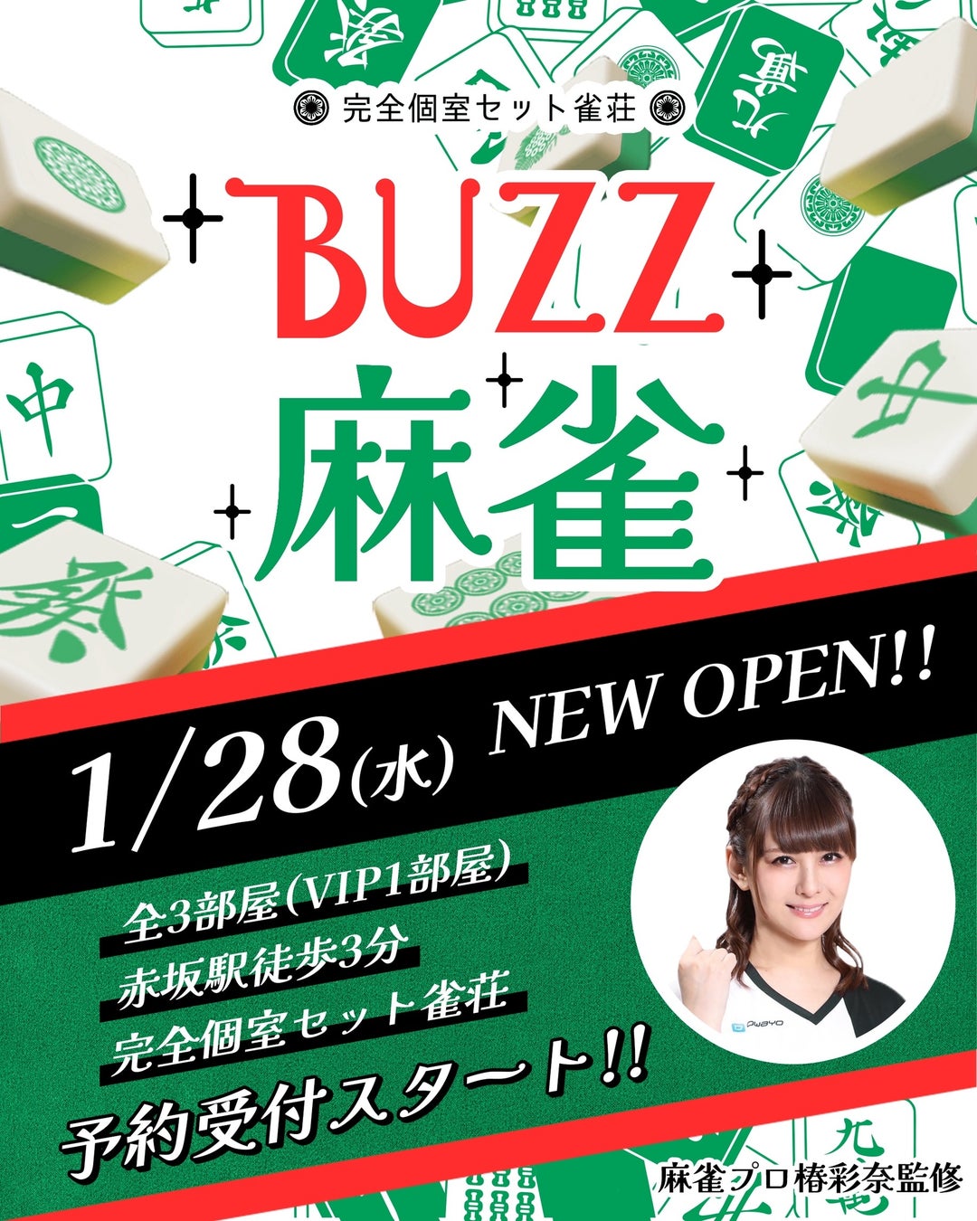 BUZZ麻雀は、赤坂駅から徒歩3分、溜池山王駅10番出口から徒歩5分、赤坂見附駅 11番(エレベーター)出口から徒歩6分。好立地に誕生する「完全個室×アモスレックスⅢ × 高品質空間」 の新しいセット雀荘。全国84店舗以上のSTUDIO BUZZが麻雀業界に参入。椿彩奈プロデュースで、防音・清潔感・デザインにこだわった完全個室。VIPルーム〈国士無双〉が象徴的なハイクラス空間 オープンキャンペーンも予定しておりますので、ぜひ皆様のご来店をお待ちしております。BUZZ麻雀】 環境で差がつく、完全個室セット雀荘BUZZ麻雀は、個室 × 防音 × 快適性に徹底的にこだわった、新しい時代のセット雀荘です。椅子、空間、音、清潔感。すべてに妥協せず、すべての麻雀好きのための環境を提供します。