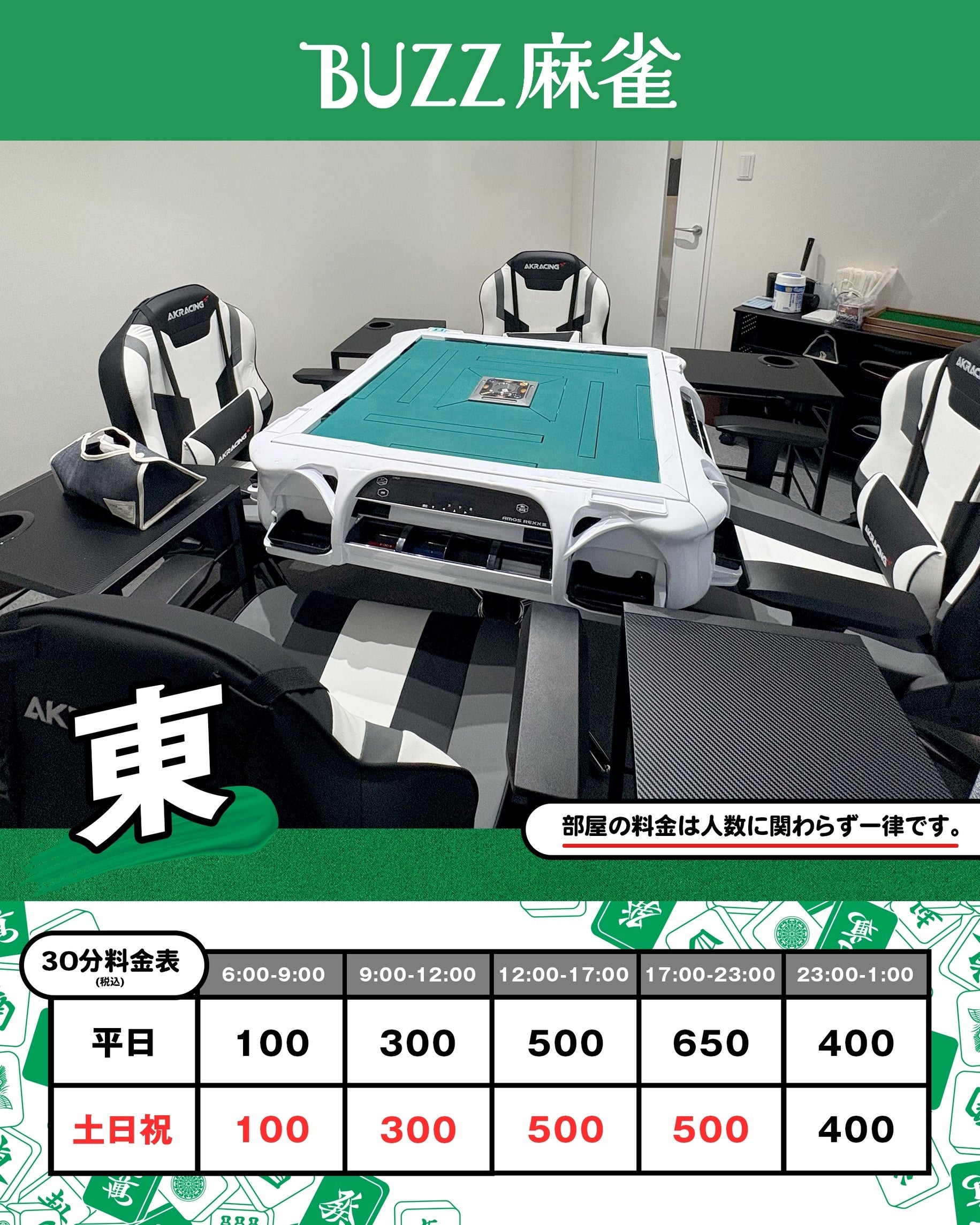 [画像:BUZZ麻雀 完全個室の内装イメージ(清潔感・高級感)]