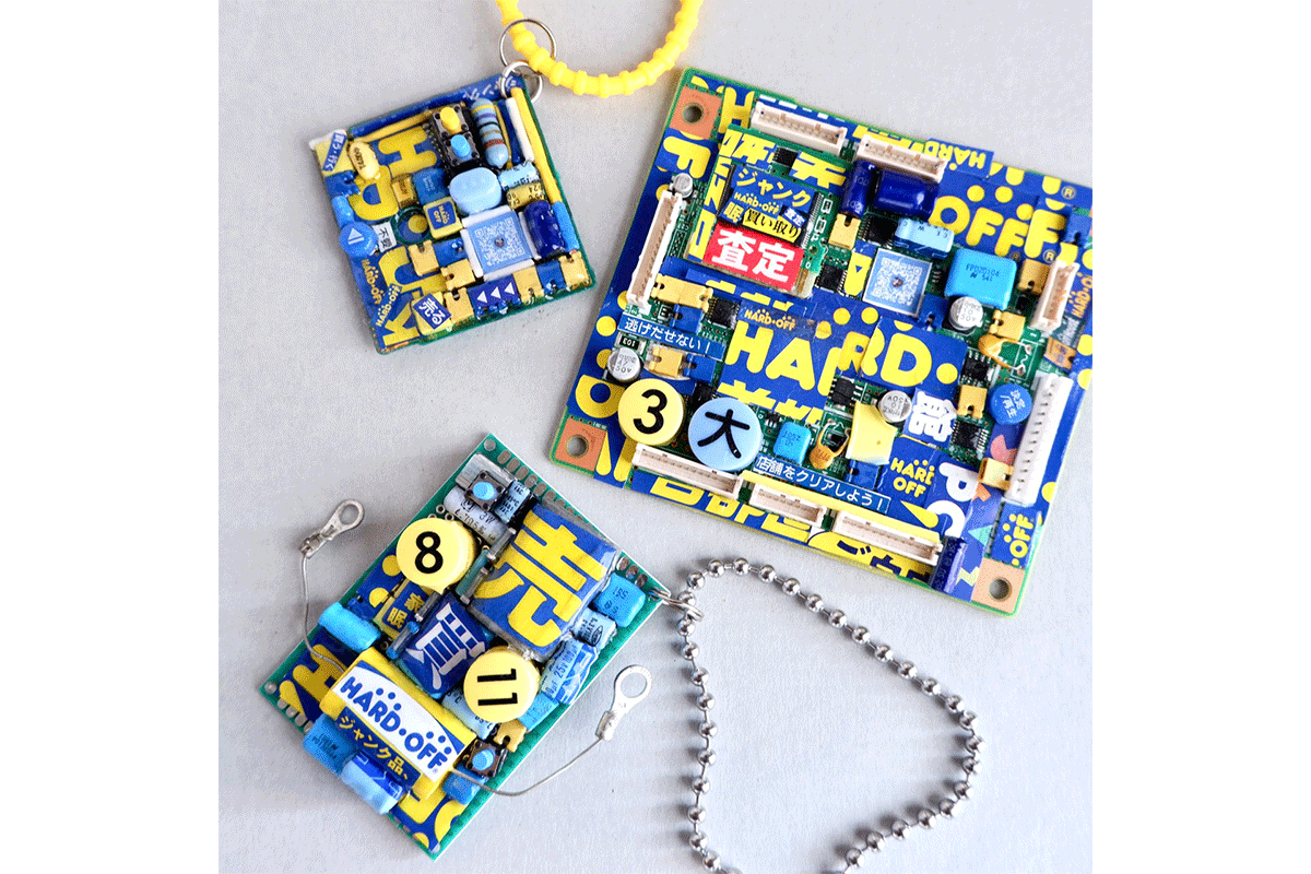 電子部品をアップサイクルして、アート作品や小物を制作しているブランド。父親が幼少期に営んでいた電気屋『新電気』をブランド名にしました。美術館のミュージアムショップや、国内外のポップアップなどに出展。今回はハードオフのジャンク品を使用して制作した作品も販売します。