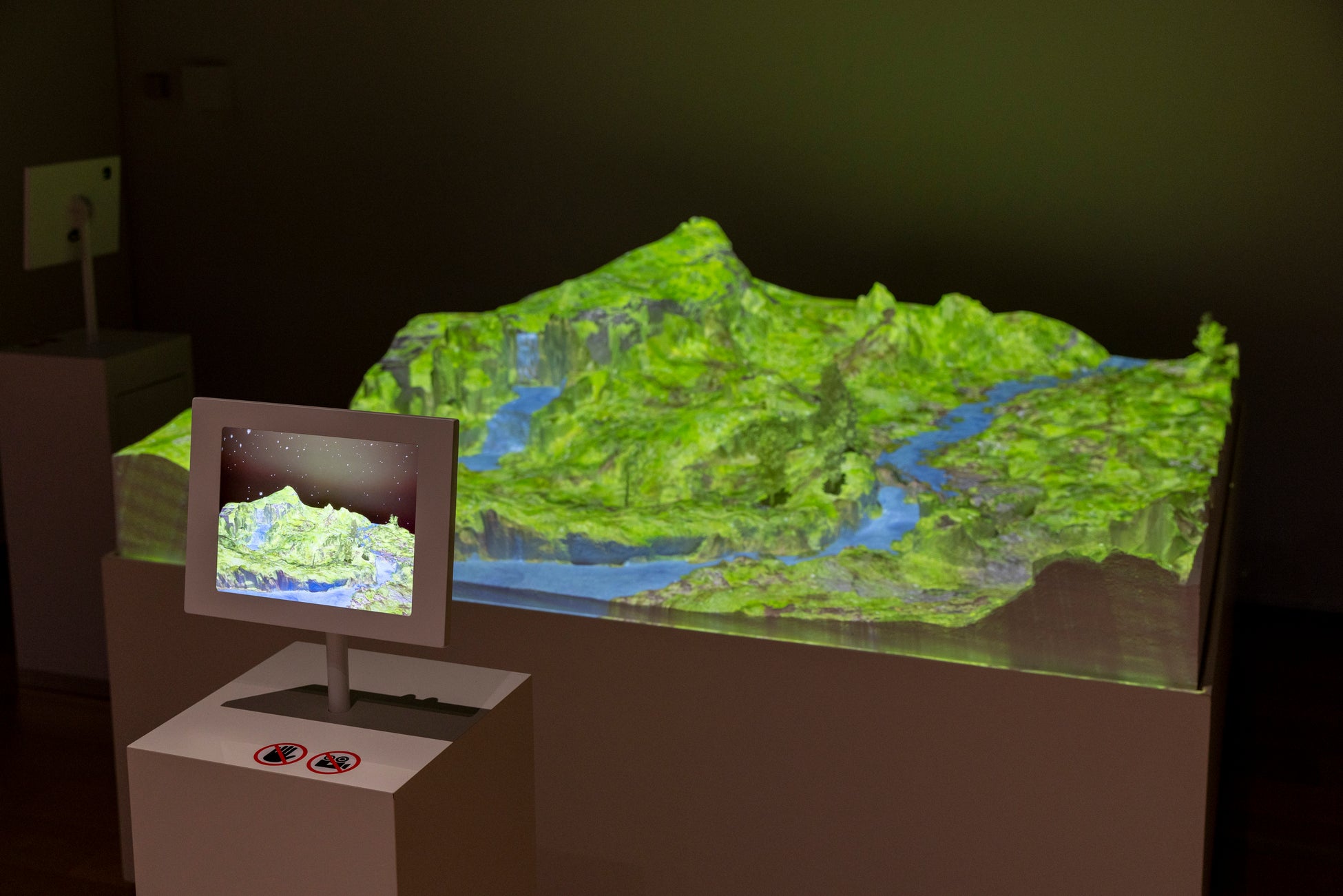 モンハン世界のフィールド模型にプロジェクションマッピングとARを組み合わせ、自然環境の作り込みや、その環境に適したモンスターをリアルに表現してきたクリエイターの創造力に触れる展示です。