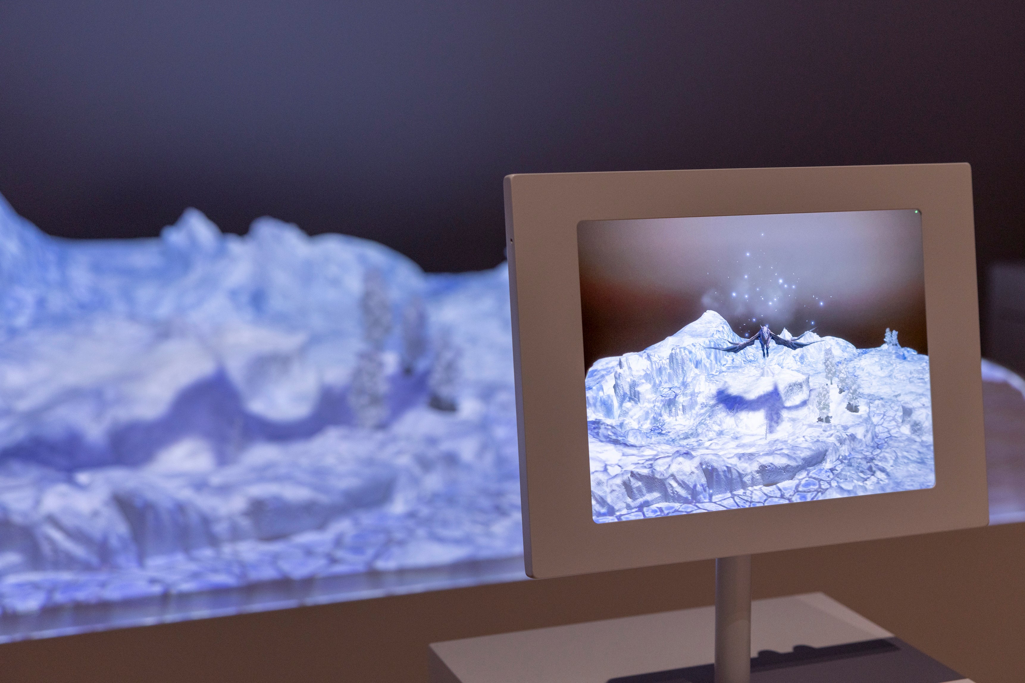 モンハン世界のフィールド模型にプロジェクションマッピングとARを組み合わせ、自然環境の作り込みや、その環境に適したモンスターをリアルに表現してきたクリエイターの創造力に触れる展示です。
