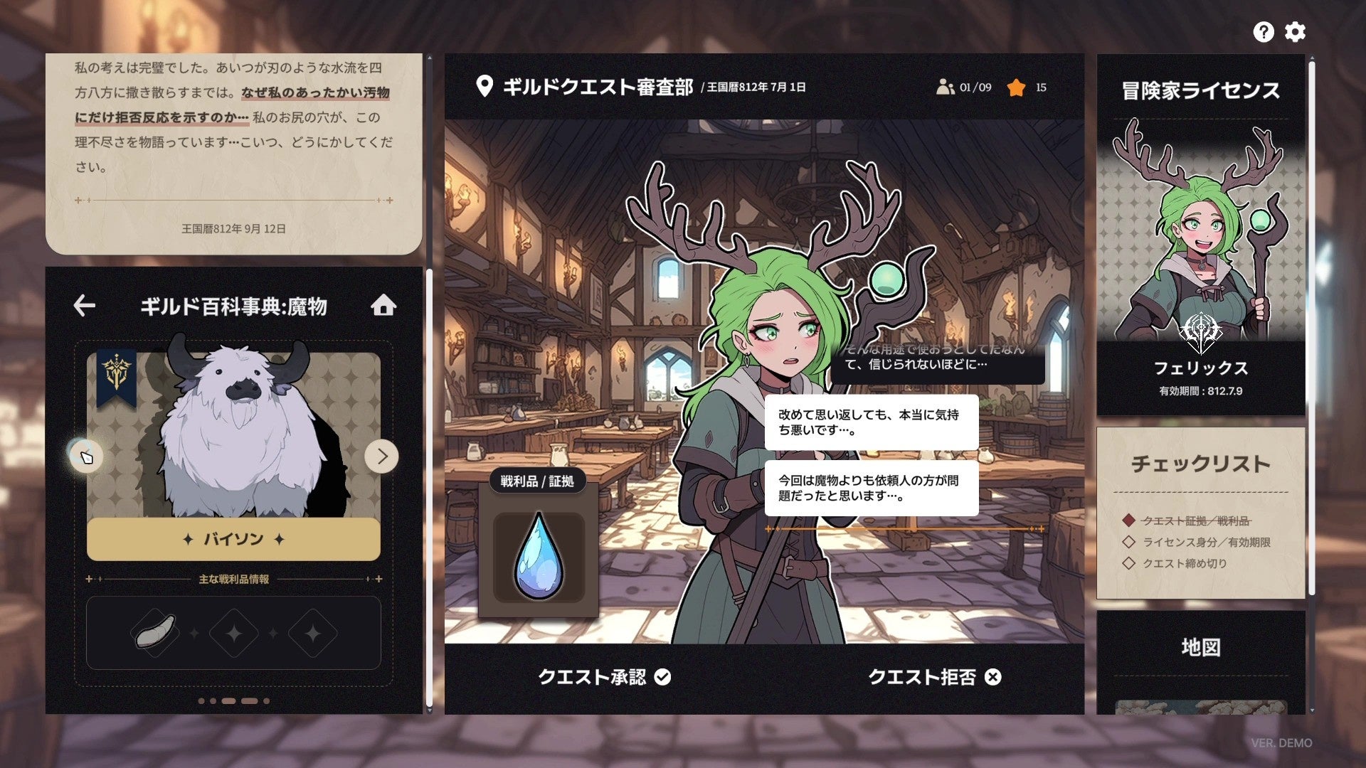 ギルドの受付係としてクエストを選び、異世界の事件を追うファンタジーシミュレーション。