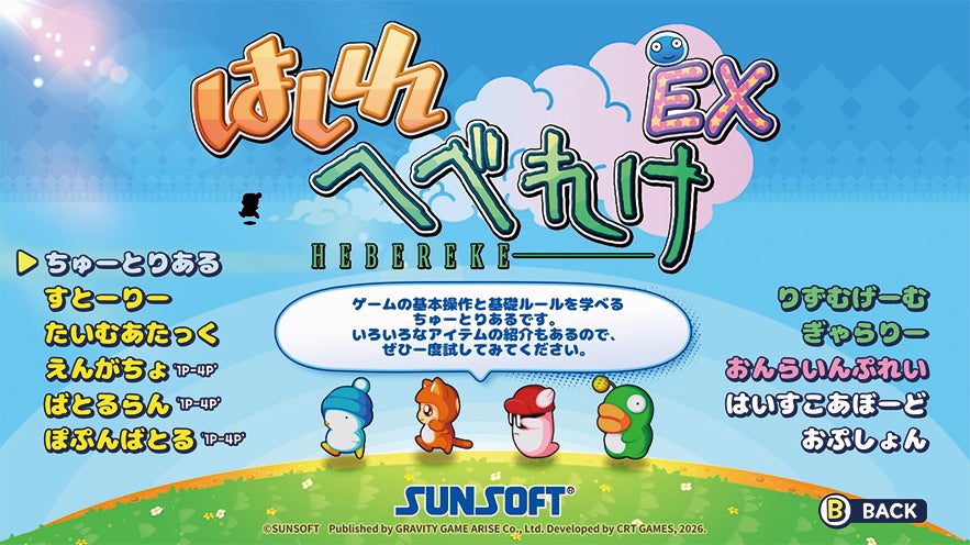 『はしれへべれけ EX』は、1994年12月22日にSUNSOFTによってスーパーファミコン向けに開発・発売されたレースアクションゲームを、現代風に再解釈したリメイク作品です。ゲームはクォータービュー視点で進行し、ユニークで可愛らしいキャラクターたちがカートを使わず自らの足で走るという独特なスタイルのレースを展開します。
