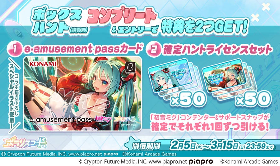 ボックスハント『初音ミク』コラボ(全34種)をコンプリートし、キャンペーンサイトでエントリーした方全員にオリジナルe-amusement passカードをプレゼントします。