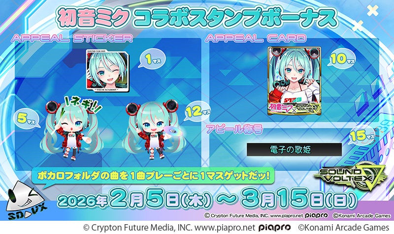 期間中、『SOUND VOLTEX ∇』をプレーし、ボカロカテゴリの曲を1曲プレーするごとに、スタンプを1つ獲得します。スタンプの数に応じて、限定「アピールステッカー」、「アピールカード」、「アピール称号」を獲得することができます。