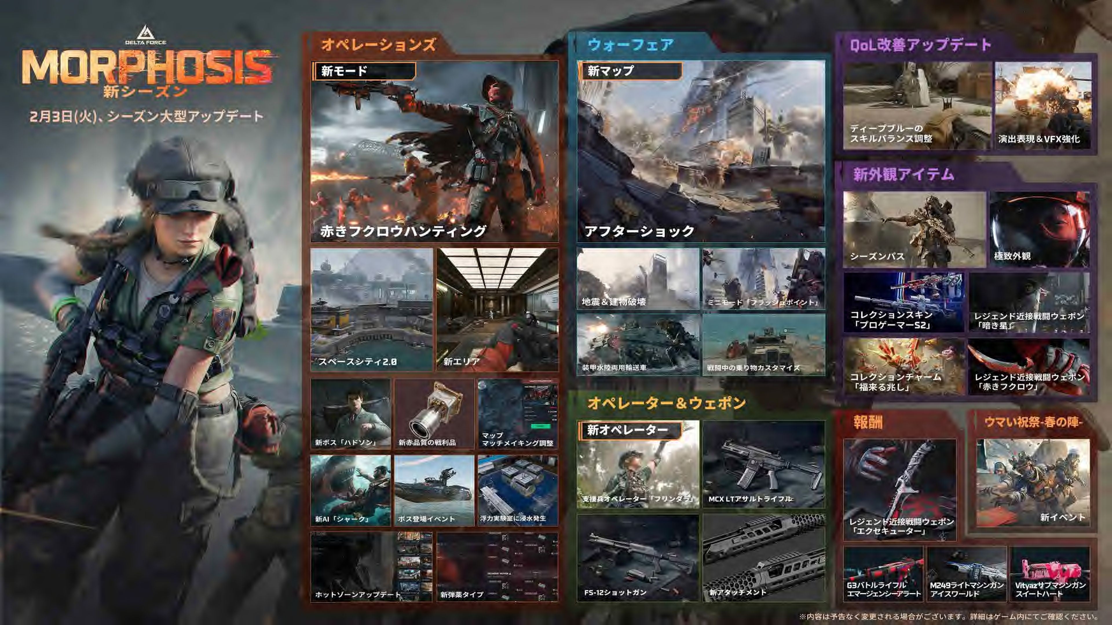 高品質なタクティカルFPS『Delta Force』を手がける Team Jade は、大型シーズンアップデート 「モーフォシス」 を本日より全プラットフォームにて配信開始しました。本作は Steam「Best of 2025」において「もっともプレイされた」部門でプラチナ評価、PlayStation Store年間ダウンロードランキングの基本プレイ無料タイトル(日本)にて第4位を獲得するなど、2025年を通じて高い支持を集めてきました。新シーズン「モーフォシス」では、その勢いをさらに加速させる豊富な新コンテンツと、プレイヤーから要望の多かった改善要素が多数実装されています。