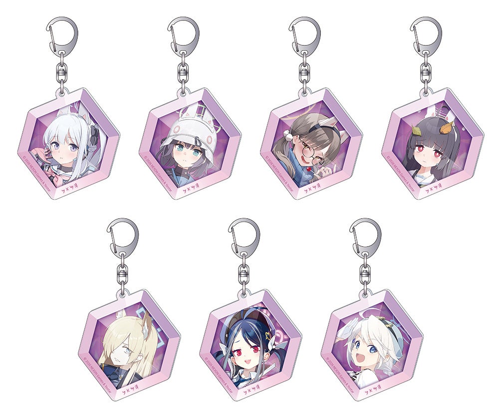今回の新商品は、SRT特殊学園のRABBIT小隊・ミヤコ、サキ、モエ、ミユ、ヴァルキューレ警察学校の公安局・カンナ、生活安全局・フブキ・キリノがドレッシーな衣装に身を包んだ描き下ろしイラストを使用。「アクリルスタンド」や「キャラバッジコレクション」をラインナップするほか、「ピンバッジ」などの多数の商品を発売いたします。