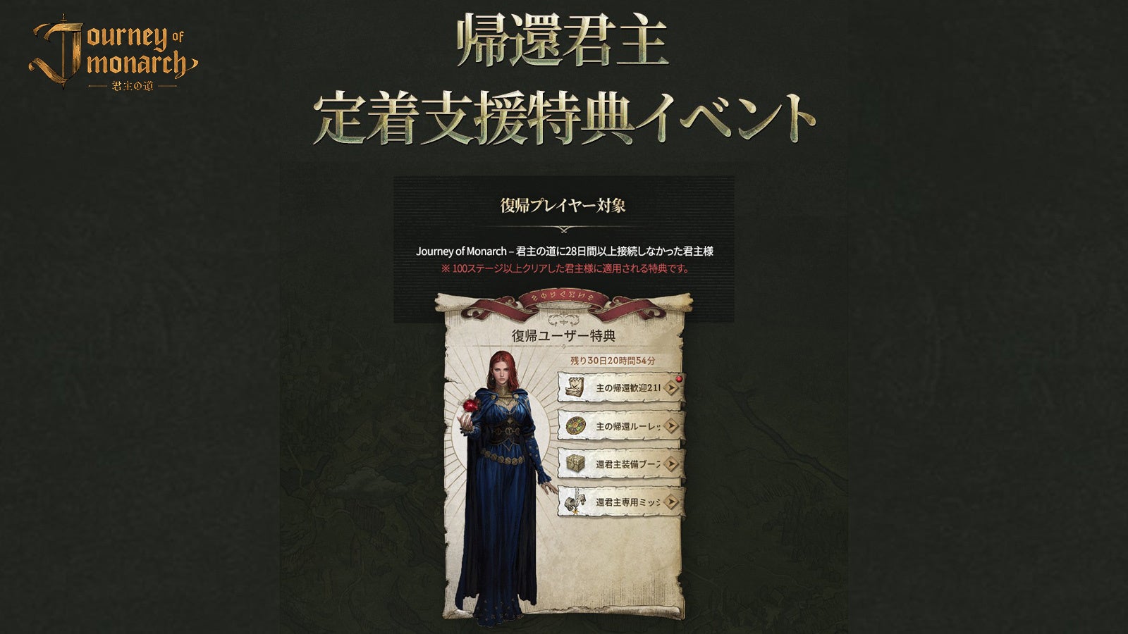 「君主の道」への復帰を考える君主の皆様を対象とした「帰還君主定着支援特典イベント」を開催します。このイベントは復帰された君主の皆様が、素早く合流することができるようになっており、ポップアップから復帰特典を確認することが可能です。