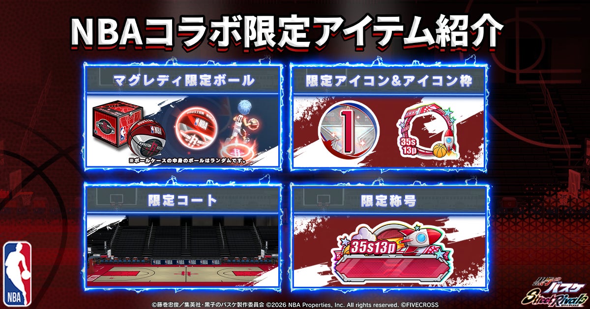 株式会社ファイブクロスは、アニメ『黒子のバスケ』の3Dバスケゲーム『黒子のバスケ Street Rivals』(黒バスSR)が、2026年2月4日(水)より北アメリカのバスケットボールのプロリーグ「National Basketball Association(通称「NBA」)」のレジェンド選手たちとコラボを開催することをお知らせいたします。