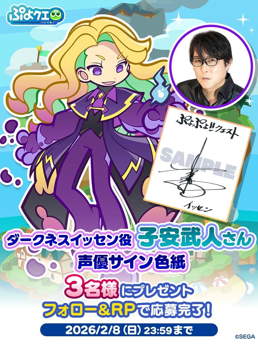 内容:『ぷよぷよ!!クエスト(ぷよクエ)』公式Xアカウントにて、キャンペーンに参加した方の中から抽選で3名様に、「ダークネスイッセン」役 子安武人さんのサイン色紙をプレゼントするキャンペーンを開催します。